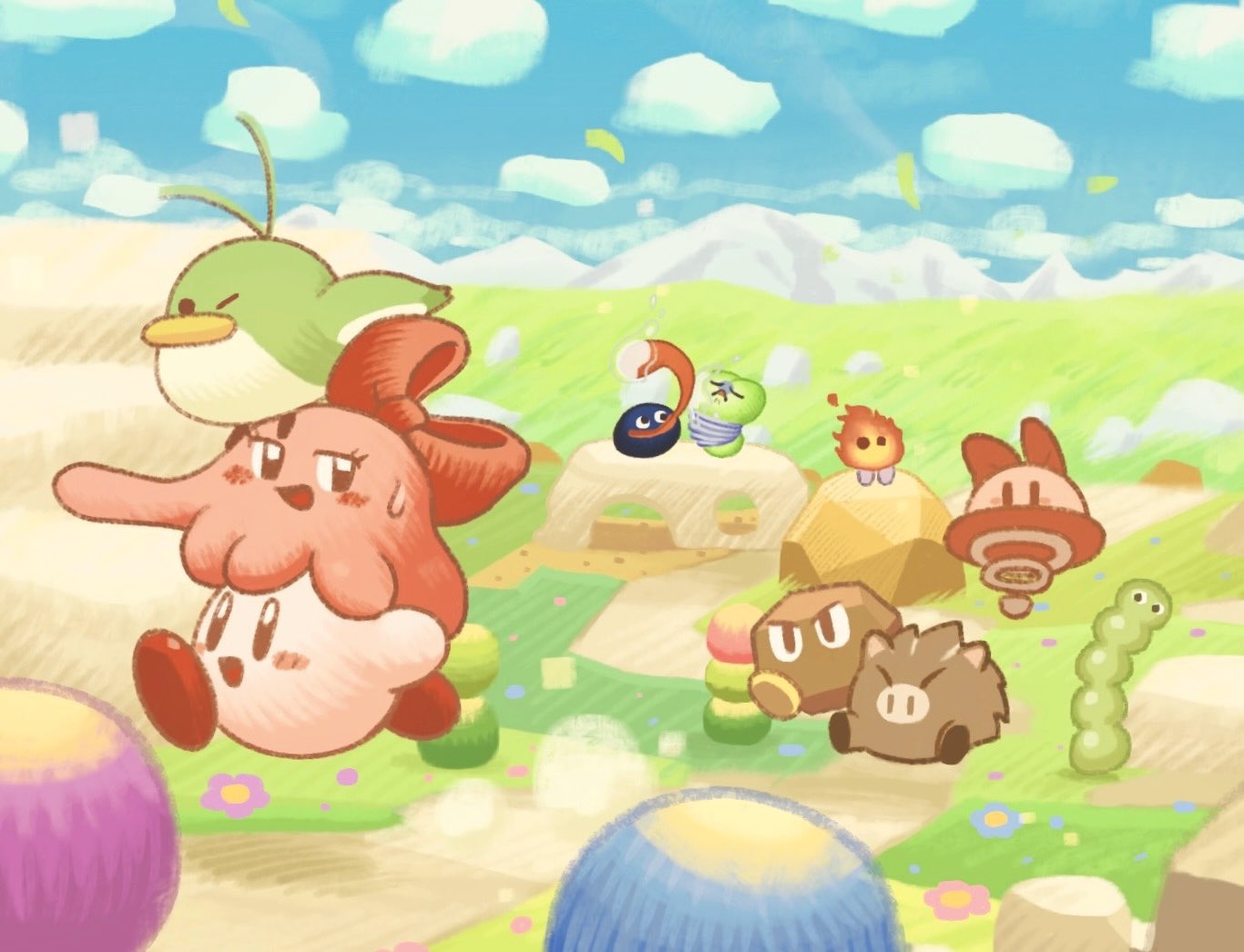 blush stickersbowflowergrasshair bowlickinglooking backmountainous horizonopen mouthoutdoorspopon (kirby)ridingrockrunningsmilesweatdroptonguetongue out