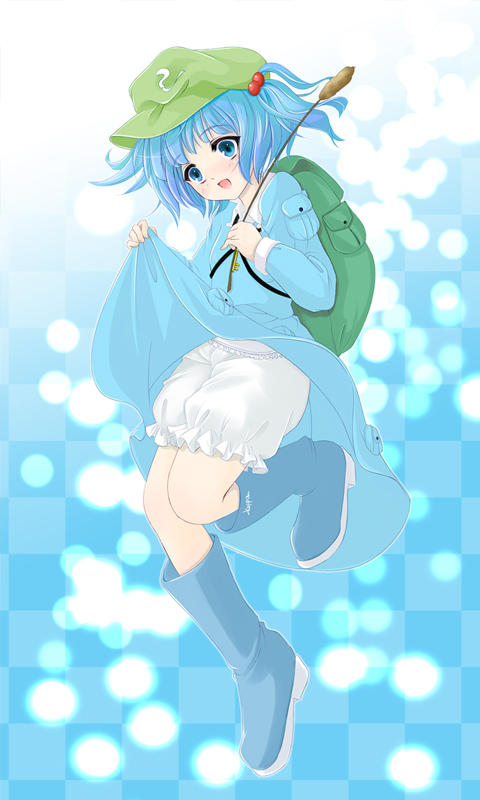 1girlbackpackbagbloomersblue eyesblue hairbootsfemale focushair bobbleshair ornamenthatkeymatching hair/eyesrandoserushort hairsolotwintailstwo side upunderwear