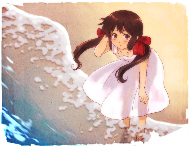 00s1girladjusting hairbarefootbeachbowbrown hairdressfemale focushair bowholdingholding own hairleaning forwardoceansee-through clothessee-through silhouetteshoresoaking feetsolotucking hairwadingwaterwhite dress