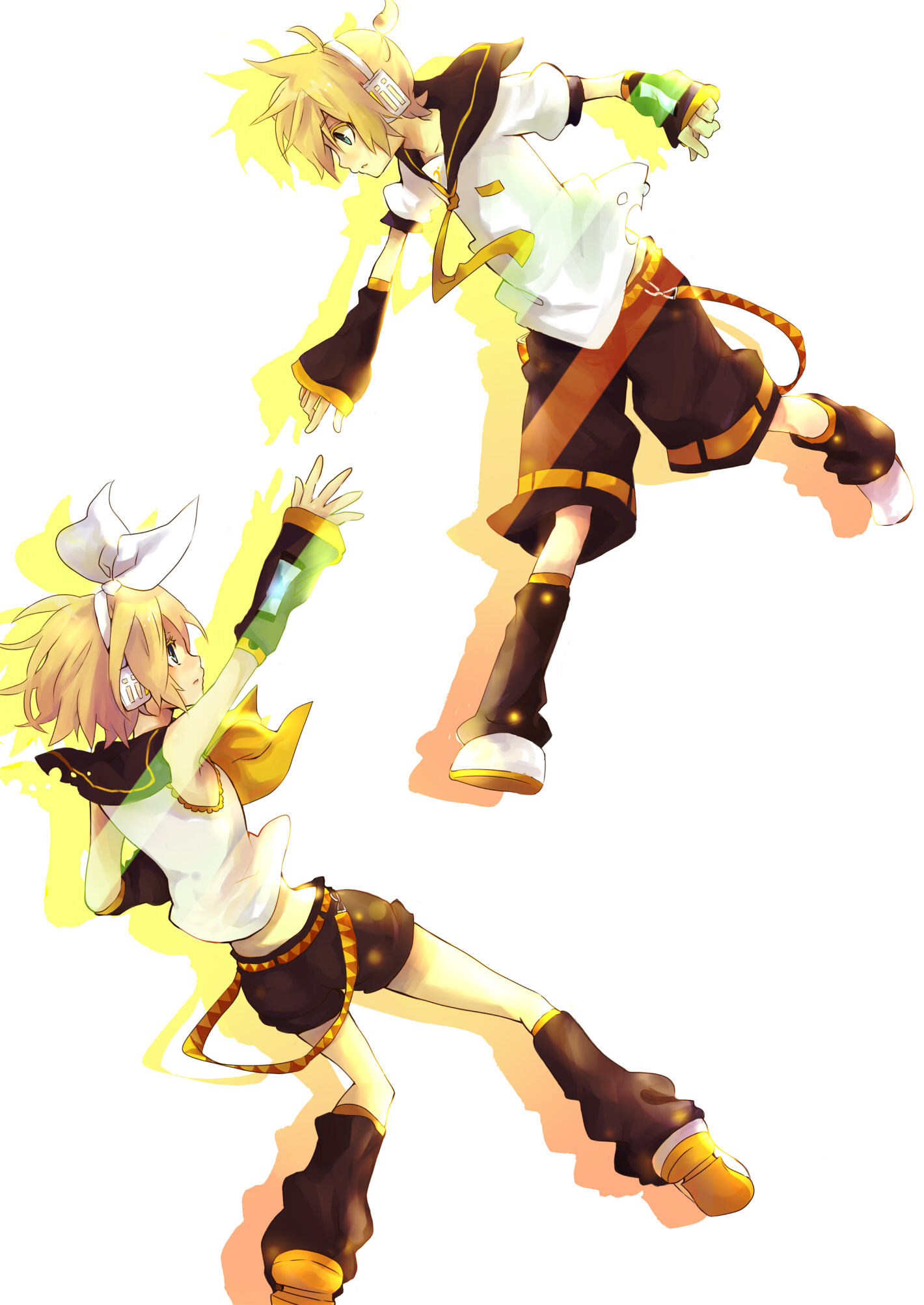 1boy1girlblonde hairblue eyesbrother and sisterhair ribbonheadphonesnecktieribbonshort hairshortssiblingssimple backgroundtwinsyellow necktie