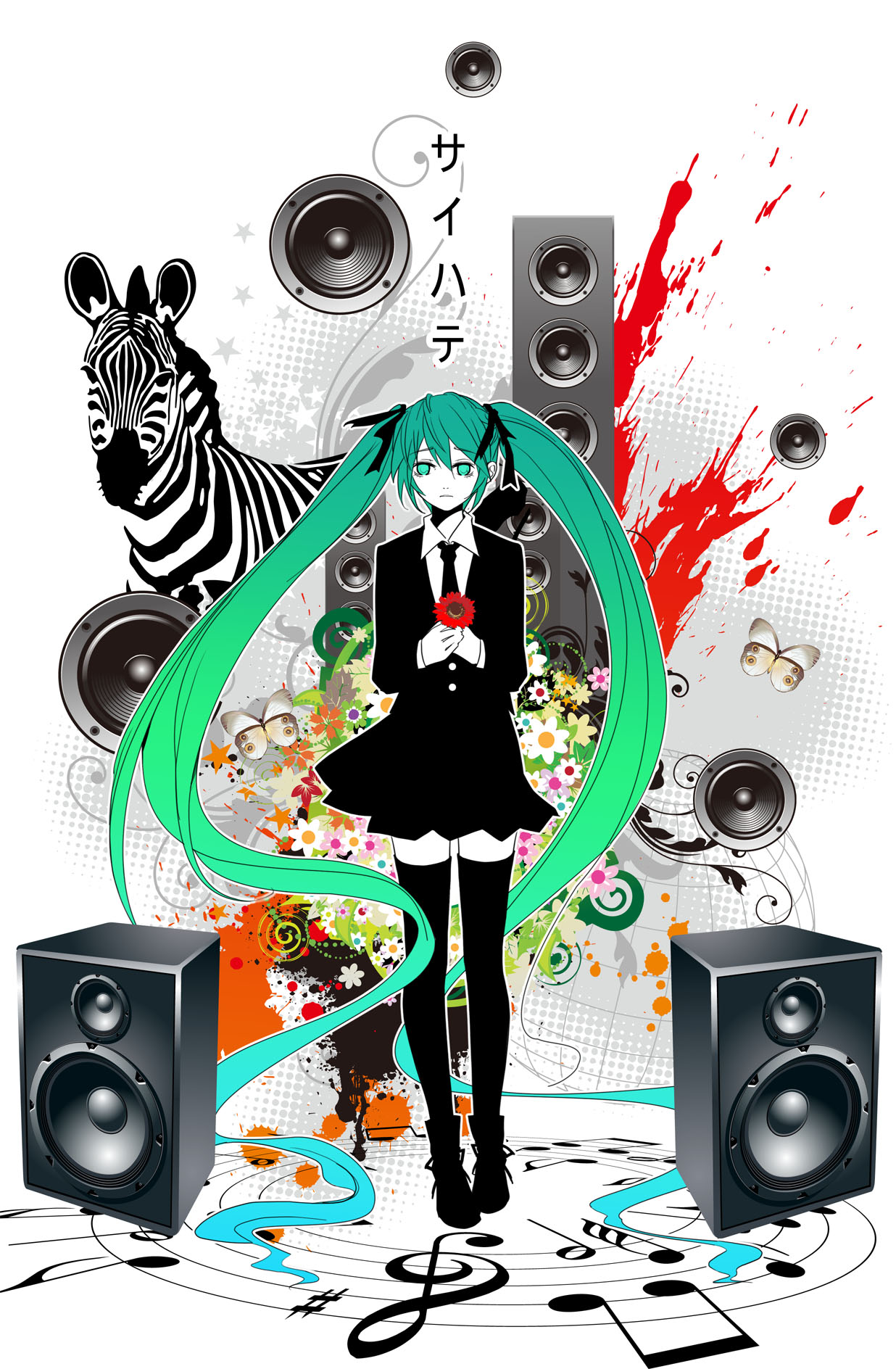 1girlaqua hairbloodblue hairbugbutterflydaisy (flower)female focusflowerformal clothesgradient hairgreen hairhair ribboninsectlong hairmulticolored hairmusical notenecktiepartially coloredribbonsolospeakersuitthighhighstwintailsvery long hairzebrazettai ryouiki