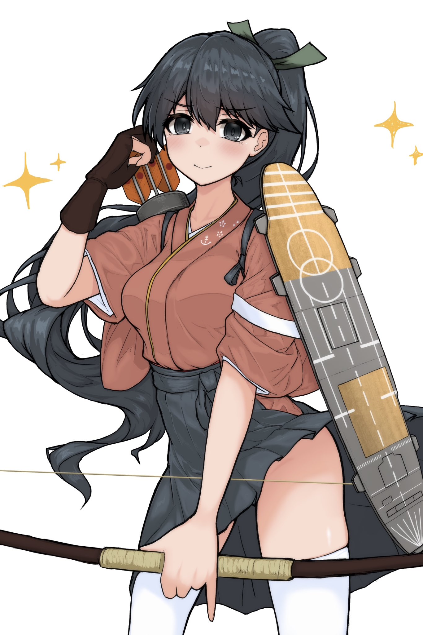 1girlarrow (projectile)black hairblack hakamabow (weapon)brown glovesflight deckglovesgrey eyeshakamajapanese clotheskimonopartially fingerless glovespartly fingerless glovespink kimonoponytailquivershieldsimple backgroundsingle glovesmilesolosparklestandingtasukithighhighsweaponwhite backgroundwhite thighhighsyugake