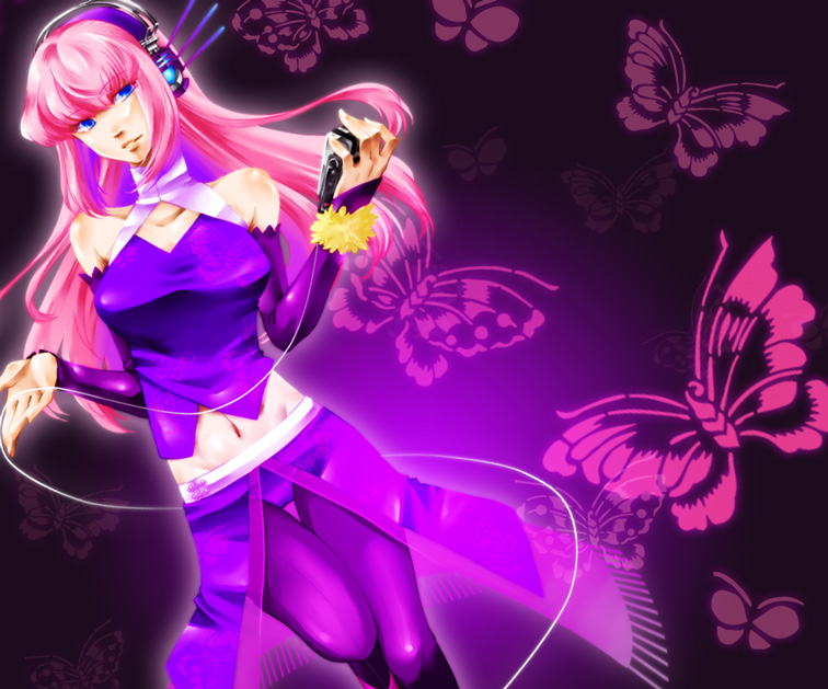 1girlalternate hairstyleblue eyesbugbutterflyfemale focusheadphonesheadsetinsectlong hairmidriffnavelpantiespantyhosepink hairpurple pantyhosesee-through clothesskirtsolounderwear