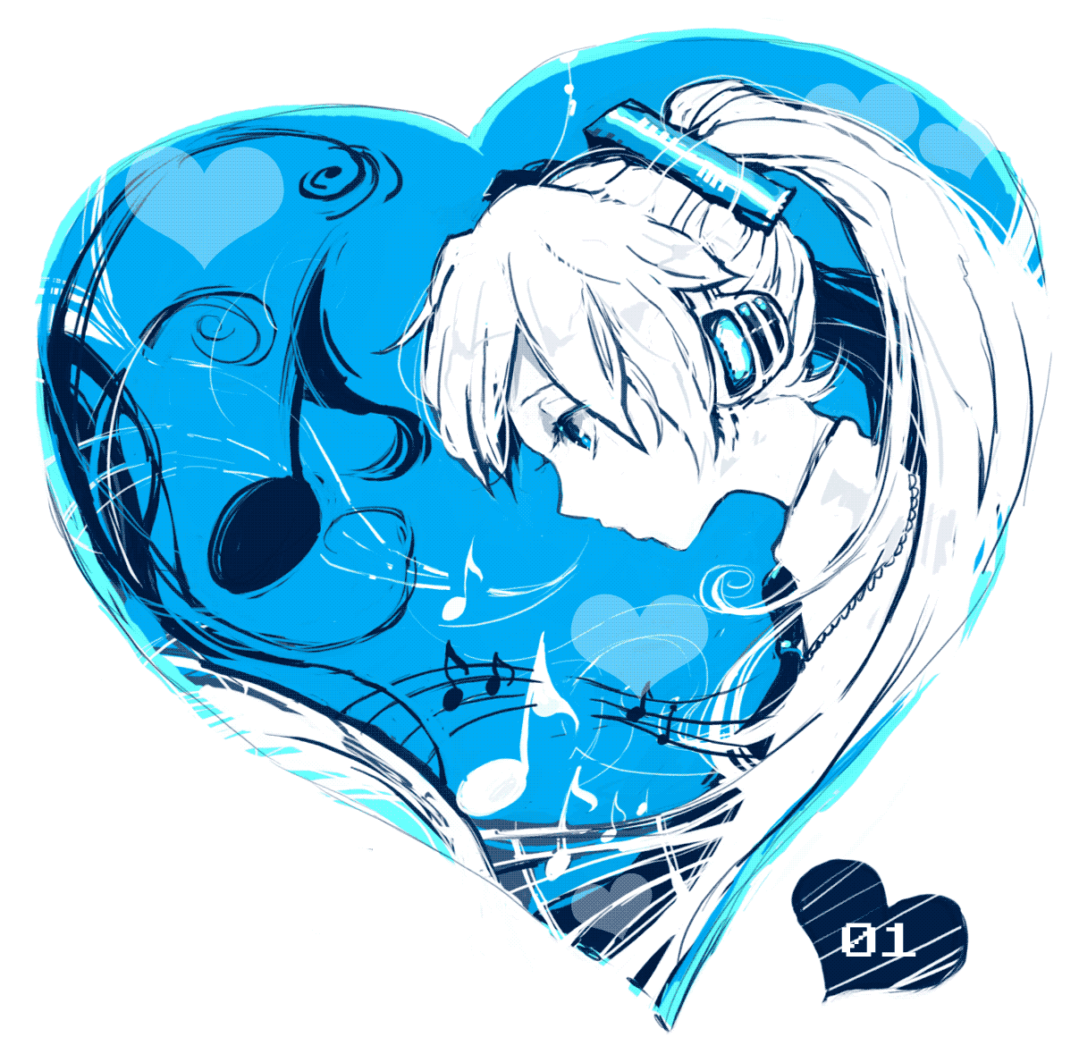 1girlblue eyesblue themefemale focusheadphonesheartlong hairmonochromemusical notesolotwintails