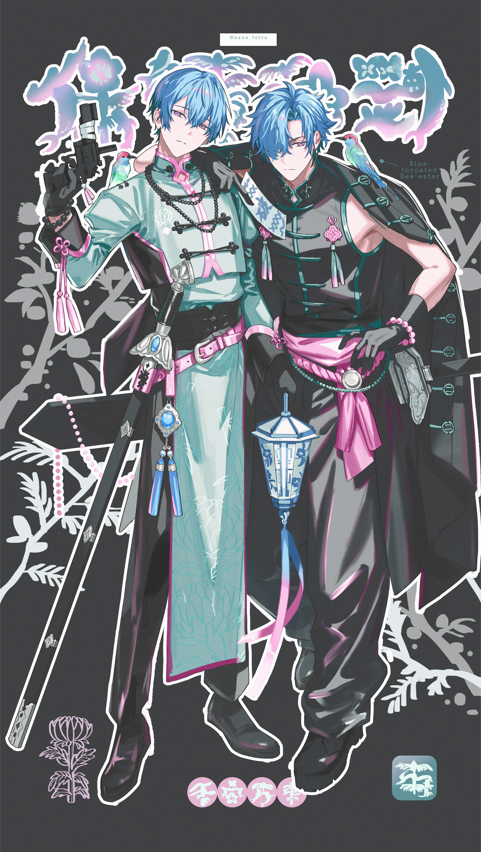 2boysanimalanimal on headarm on another's shoulderbead braceletbeadsbeltbirdbird on headblack backgroundblack glovesblue hairbraceletchinese clothescoatcoat on shouldersfrownglovesgunholdingholding gunholding weaponjewelrylanternmale focusmultiple boyson headoutlinepink eyessheathsheathedshort hairsimple backgroundswordtangzhuangtwitter usernameweapon
