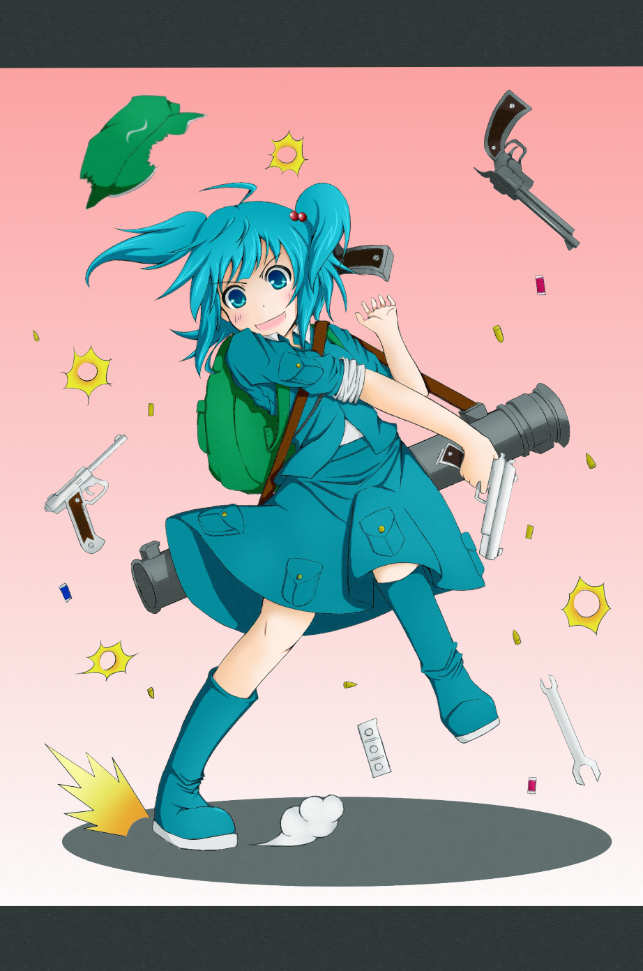 1girlbackpackbagblue eyesbootsbulletfemale focusfull bodygunhair bobbleshair ornamenthatrandoserusolotwintailstwo side upweapon