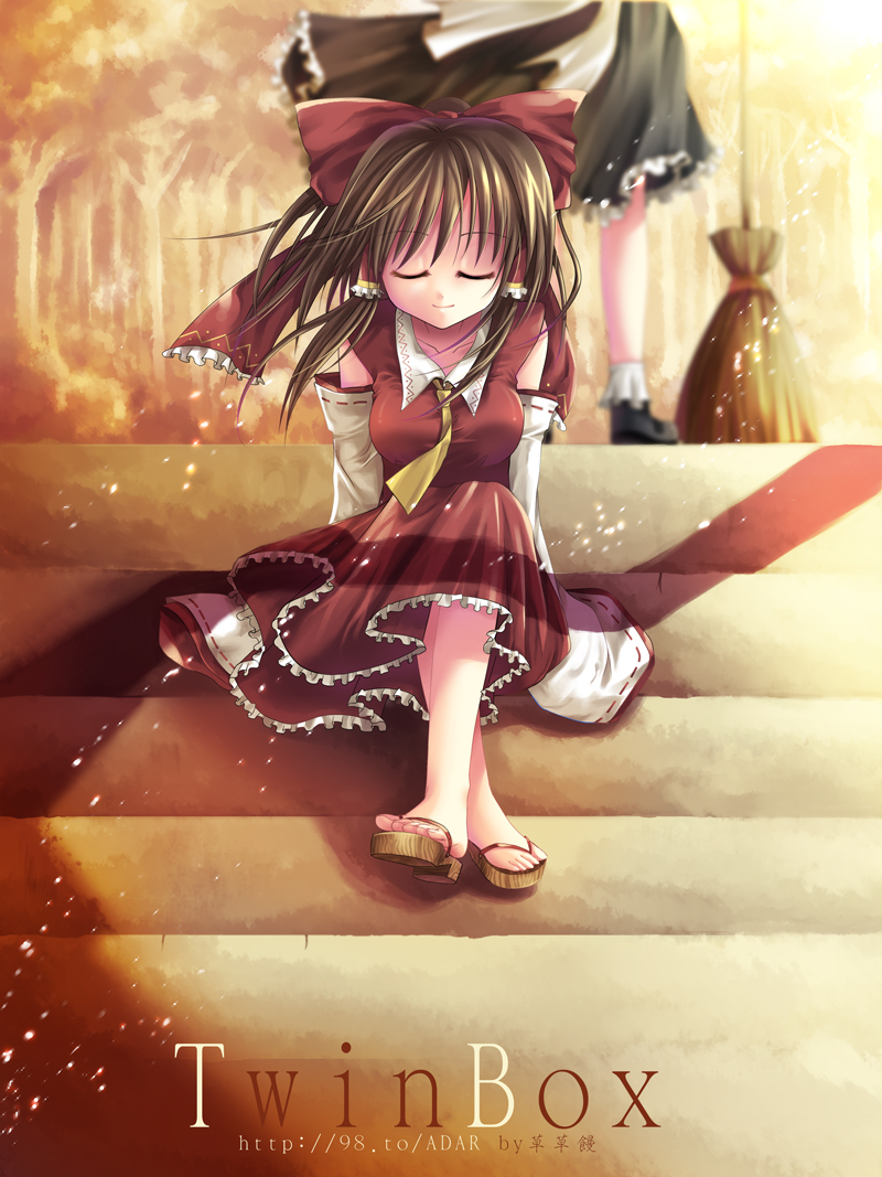 2girlsblurrybobby socksbowbreastsbroombrown hairclosed eyescrossed legsdepth of fielddetached sleevesfemale focushair bowjapanese clothesmedium breastsmikomultiple girlsno socksribbonsandalsshirtshort hairsittingsitting on stairssmilesocksstairstaut clothestaut shirt