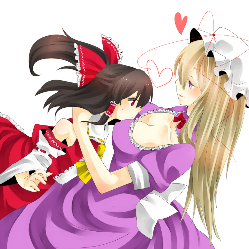 2girlsbare shouldersblonde hairbreastsbrown haircleavagedetached sleevesfemale focushatjapanese clotheslarge breastsmikomultiple girlspurple eyesred eyesyuri