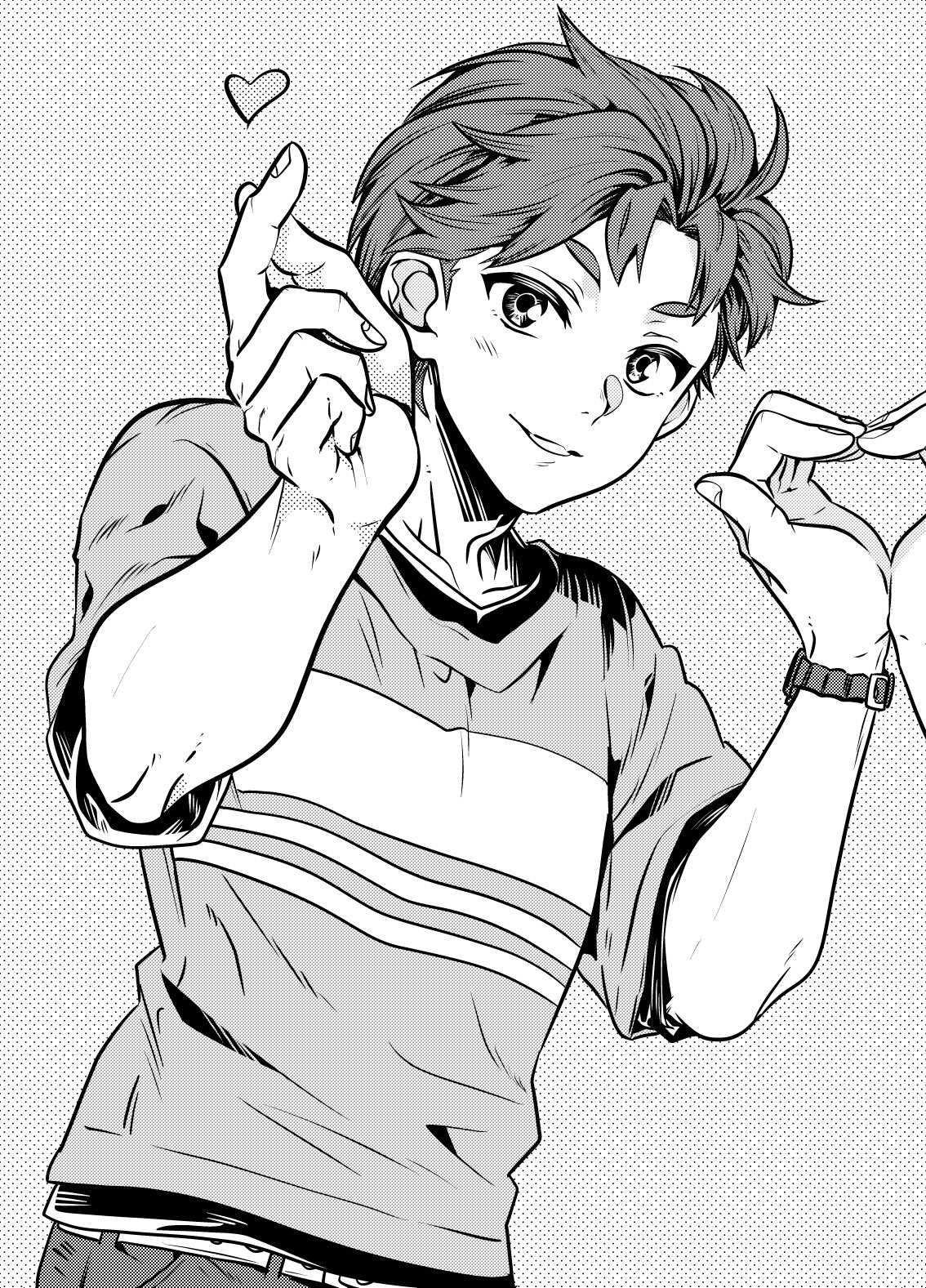 1boycasualcollarbonefingernailsgreyscalegrinheartjewelrylooking at viewermale focusmonochromeshirtshort hairshort sleevessimple backgroundsmilesolot-shirtupper bodywatchwristwatch