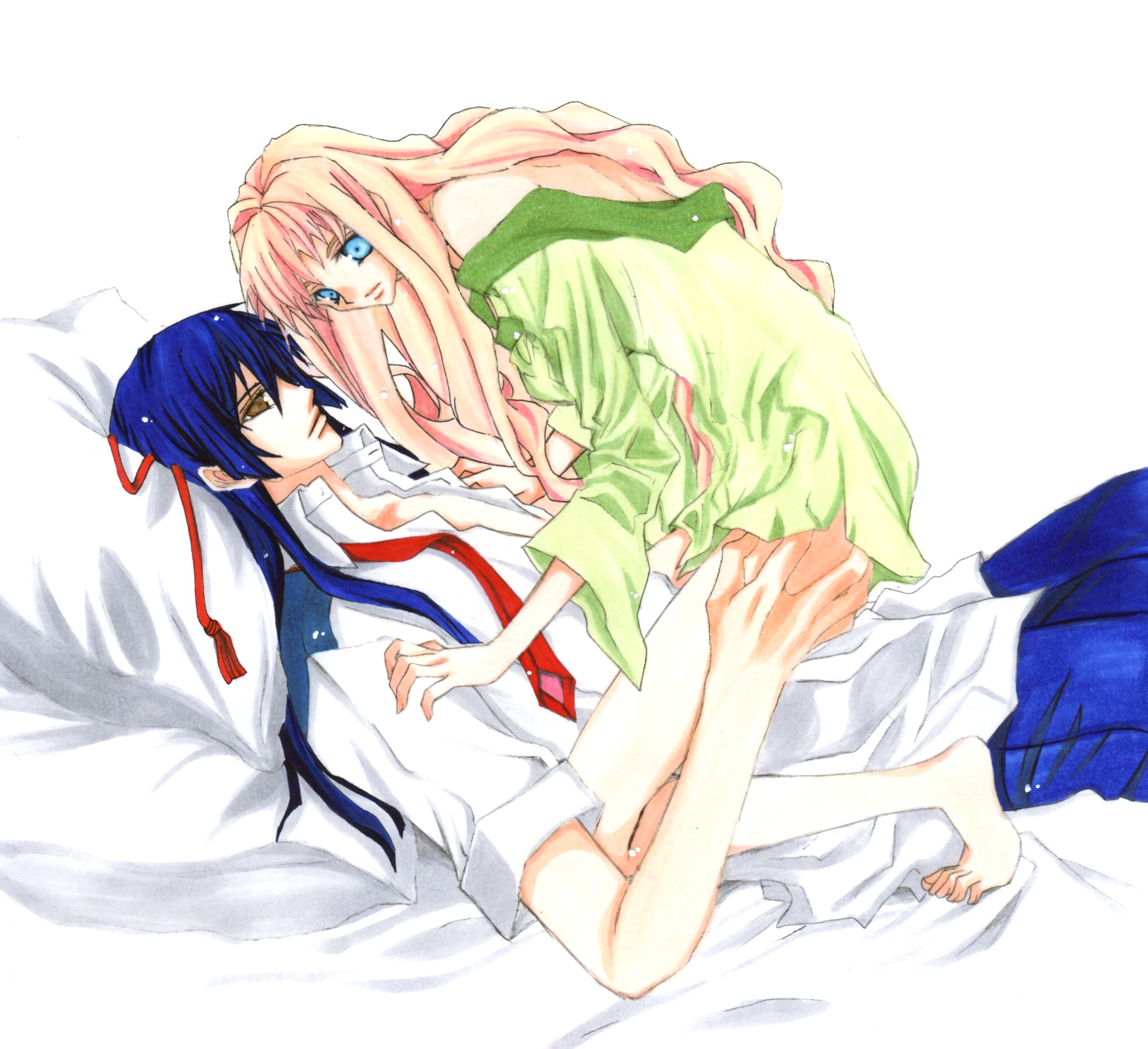 00s1boy1girlbare shouldersblue eyesblue hairbrown eyescoupleheterolegslong hairnecktiepink hairponytailthighs