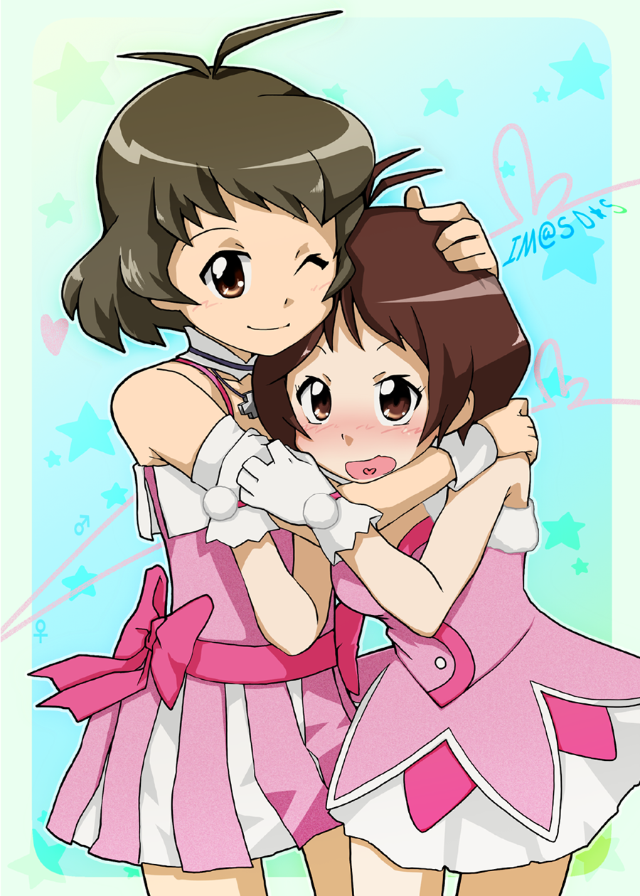 00s1boy1girlahogeantenna hairbrown haircrossdressingcute & girly (idolmaster)gradient backgroundheterohugshort hairtrap