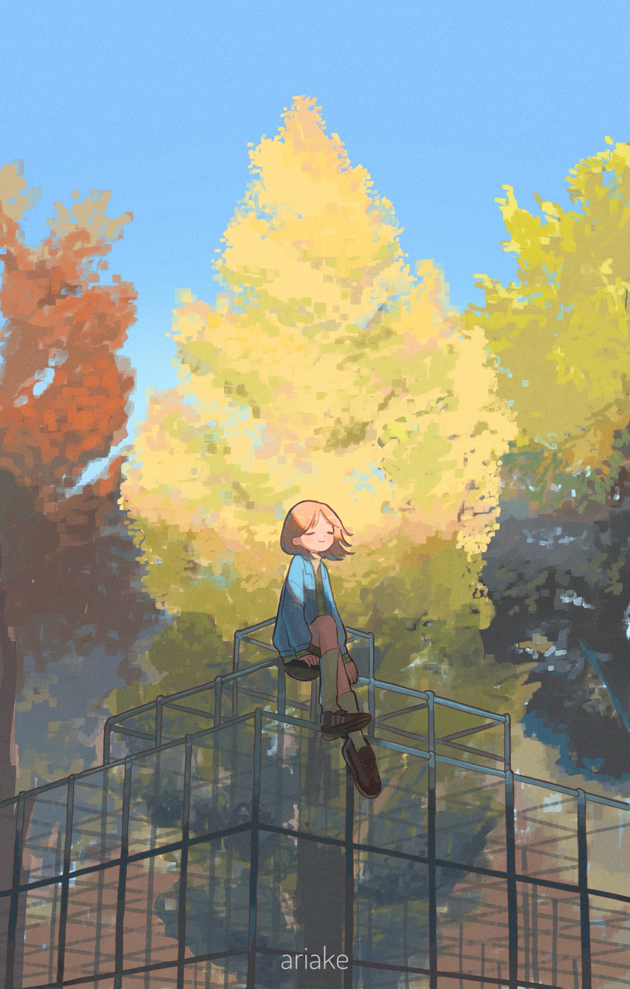 1girlbrown hairclosed eyesdayjacketjungle gymlong sleevesopen clothesopen jacketoutdoorsshort hairshortssittingskysmilesockssolosunlighttree