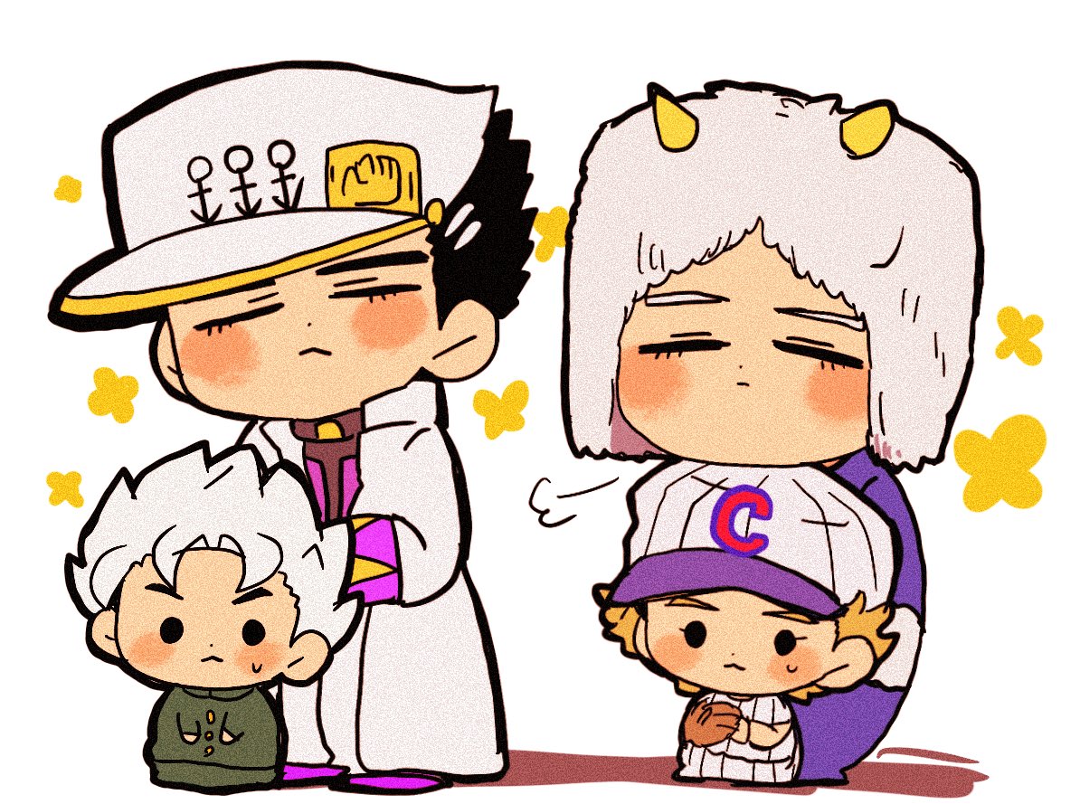 1boy4boysbaseball capbaseball glovebaseball uniformblack hairblonde hairblush stickerschibichibi onlychin restclosed eyescoatfake hornsfull bodyfur hatgakuranhathead on headhead resthorned headwearhornslong sleevesmale focusmultiple boyspointy hairpuff of airschool uniformshort hairsolid oval eyessportswearsweatwhite hair