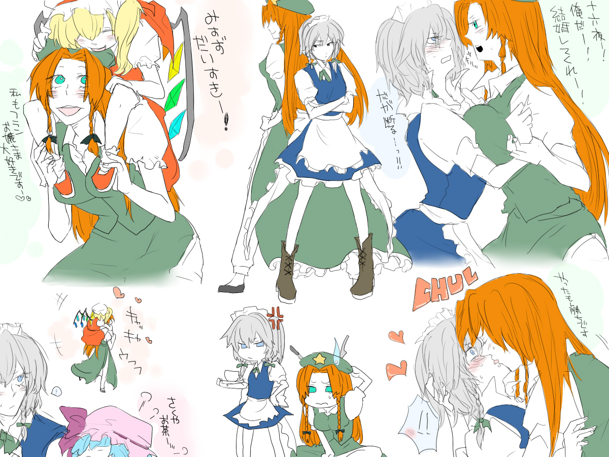 4girlsbreastscomicdressfemale focusflat colorkissmaidmultiple girlsskirtupper bodywhite backgroundyuri