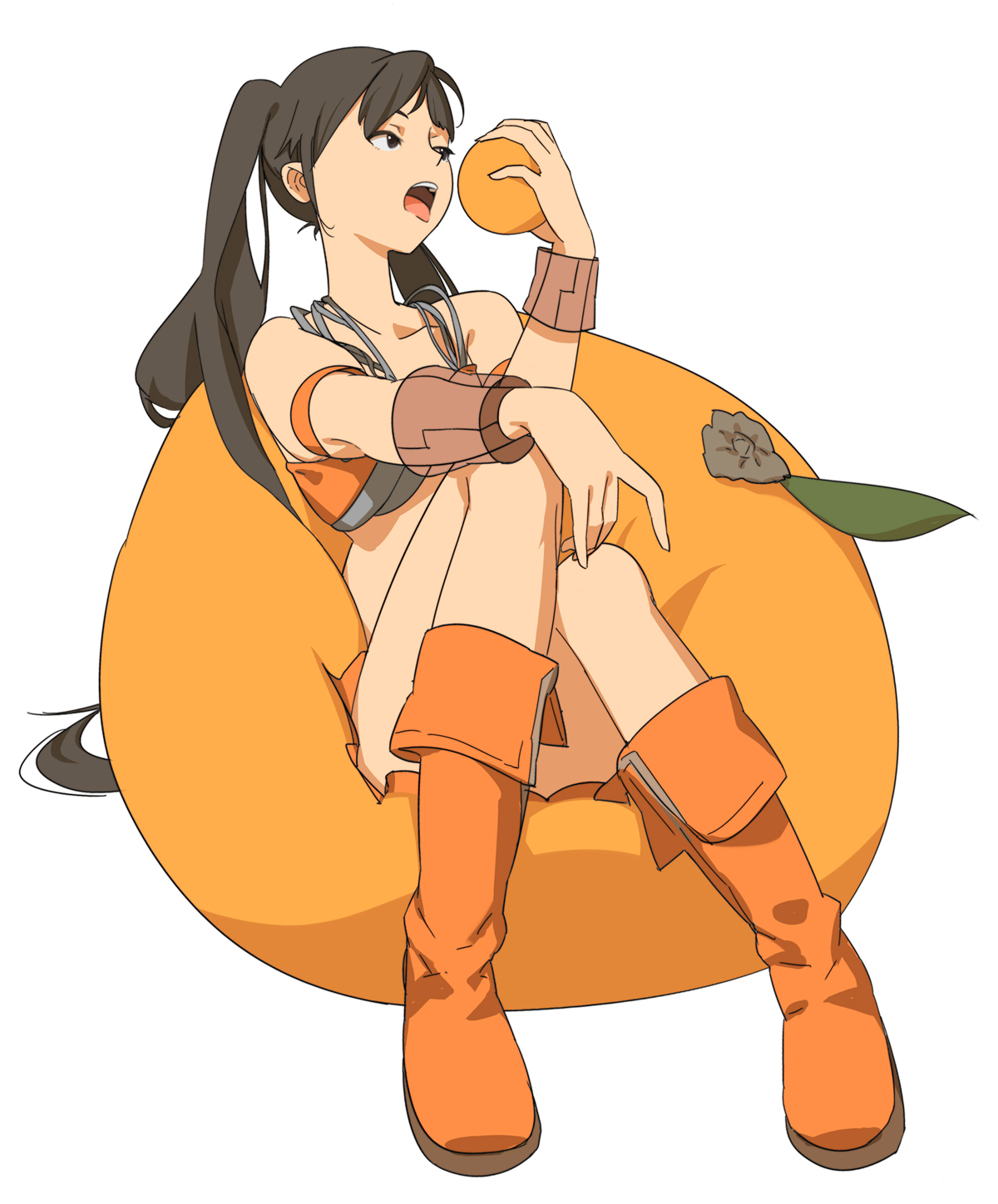 1girlbare shouldersblack hairbootsbrown eyesfemale focusfoodfruitfull bodyholdingholding foodholding fruitlong hairorange (fruit)orange bootsorange themesittingsolotwintailswhite background