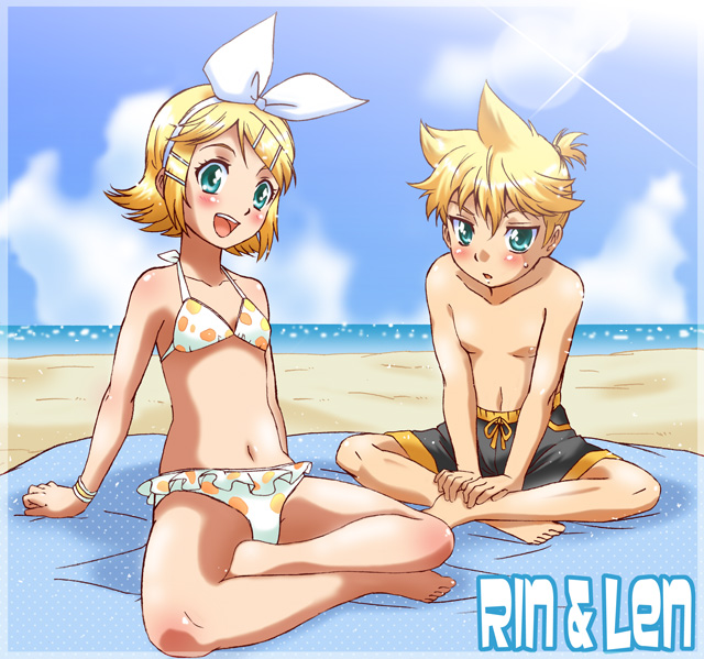 1boy1girlbarefootbeachbikiniblanketblonde hairblue eyesblushbraceletbrother and sistercharacter namecrossed legsdayflat chesthair ornamenthairbandhairclipindian stylejewelrymidriffnaveloutdoorspolka dotpolka dot bikinipolka dot swimsuitshort hairsiblingssittingswimsuittwinswater
