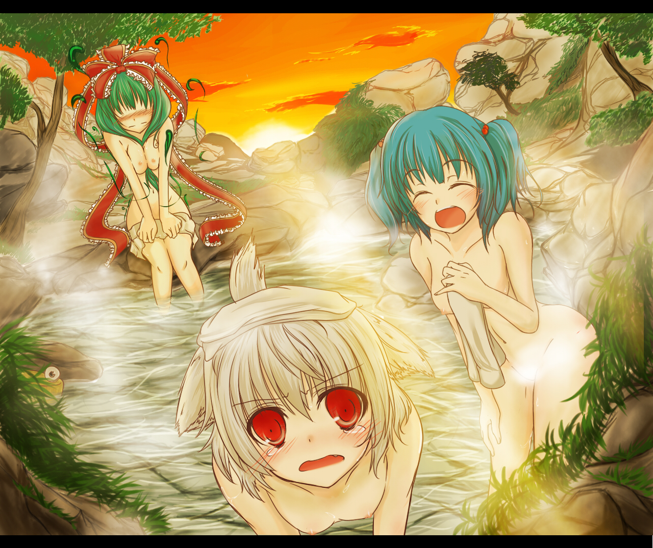 3girlsanimal earsbetween breastsblue eyesblushbreastsbreasts squeezed togethercensoredclosed eyesconvenient censoringcovering breastscovering privatesfangfemale focusfrogfront ponytailgreen hairhair bobbleshair ornamenthair over eyeshair ribbonhatmedium breastsmultiple girlsnipplesnudenude coveronsenred eyesribbonsame-sex bathingshared bathingsmall breastssteamsunsettailtearstoweltowel on headtwo side upwolf earswolf tail