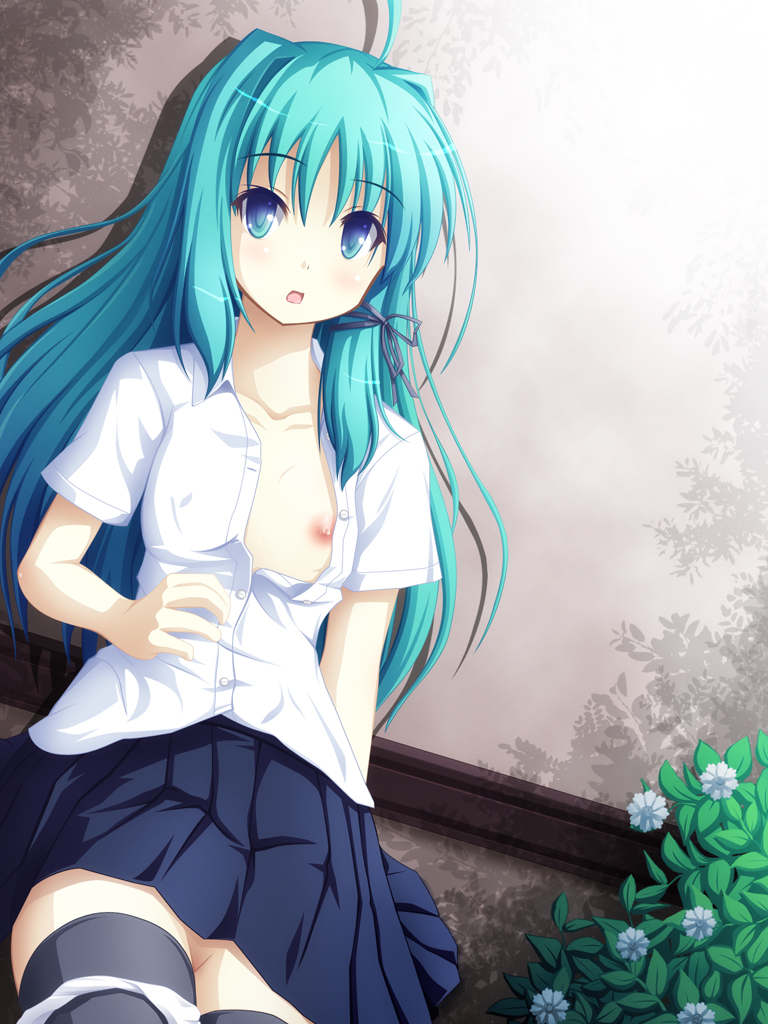 1girlaqua eyesaqua hairbreastsfemale focusflowerhair ribbonnipplesno braopen clothesopen shirtpantiespanty pullribbonshirtskirtsolothighhighsunderwear