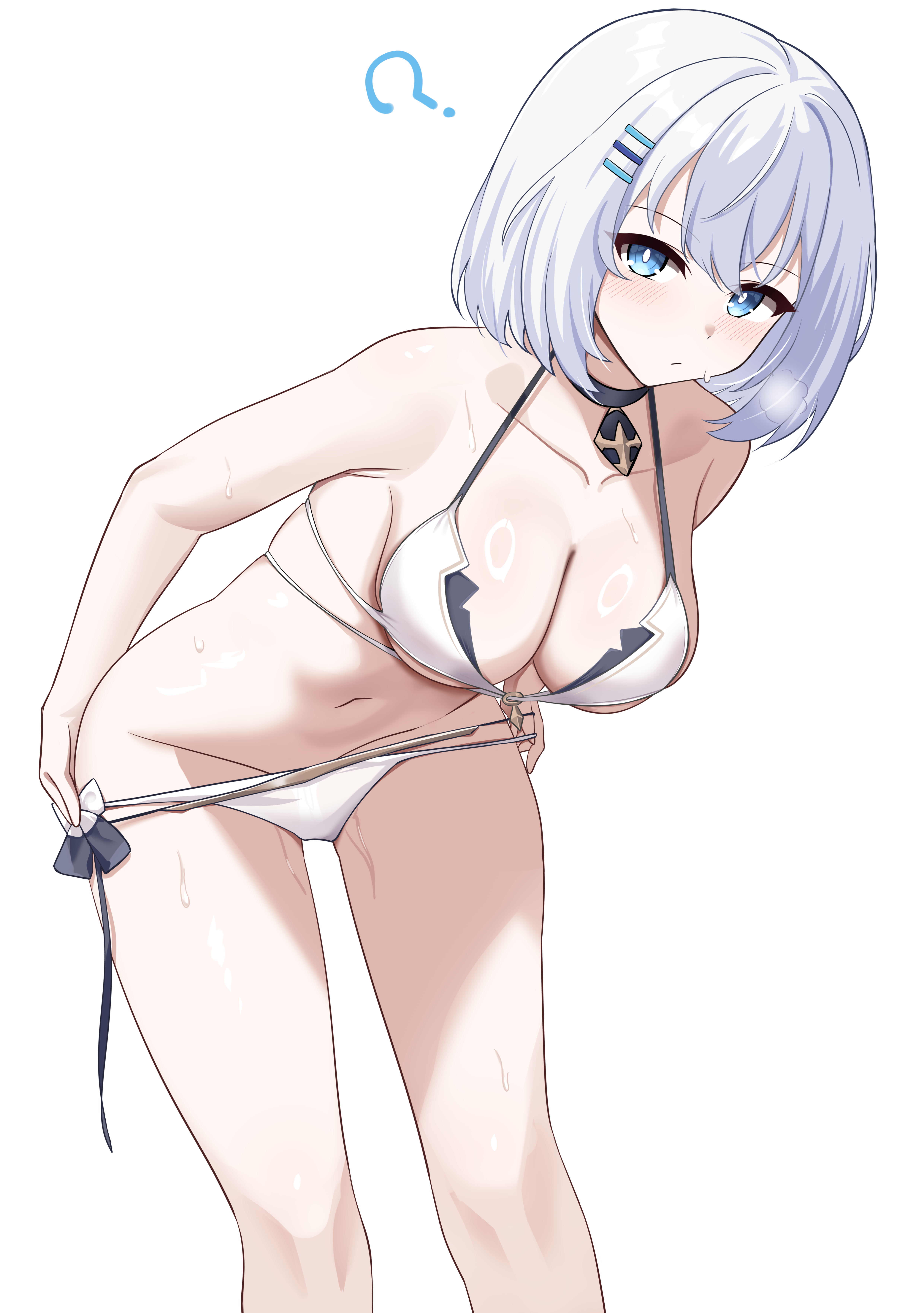 1boy1girlbent overbikiniblue eyesbreastscleavageclosed mouthcollarbonegroinhair ornamenthaircliplooking at viewermedium breastsnavelofficial alternate costumeshort hairsimple backgroundsolostomachswimsuittobiichi origami (the spirit of allure)white backgroundwhite bikiniwhite hair