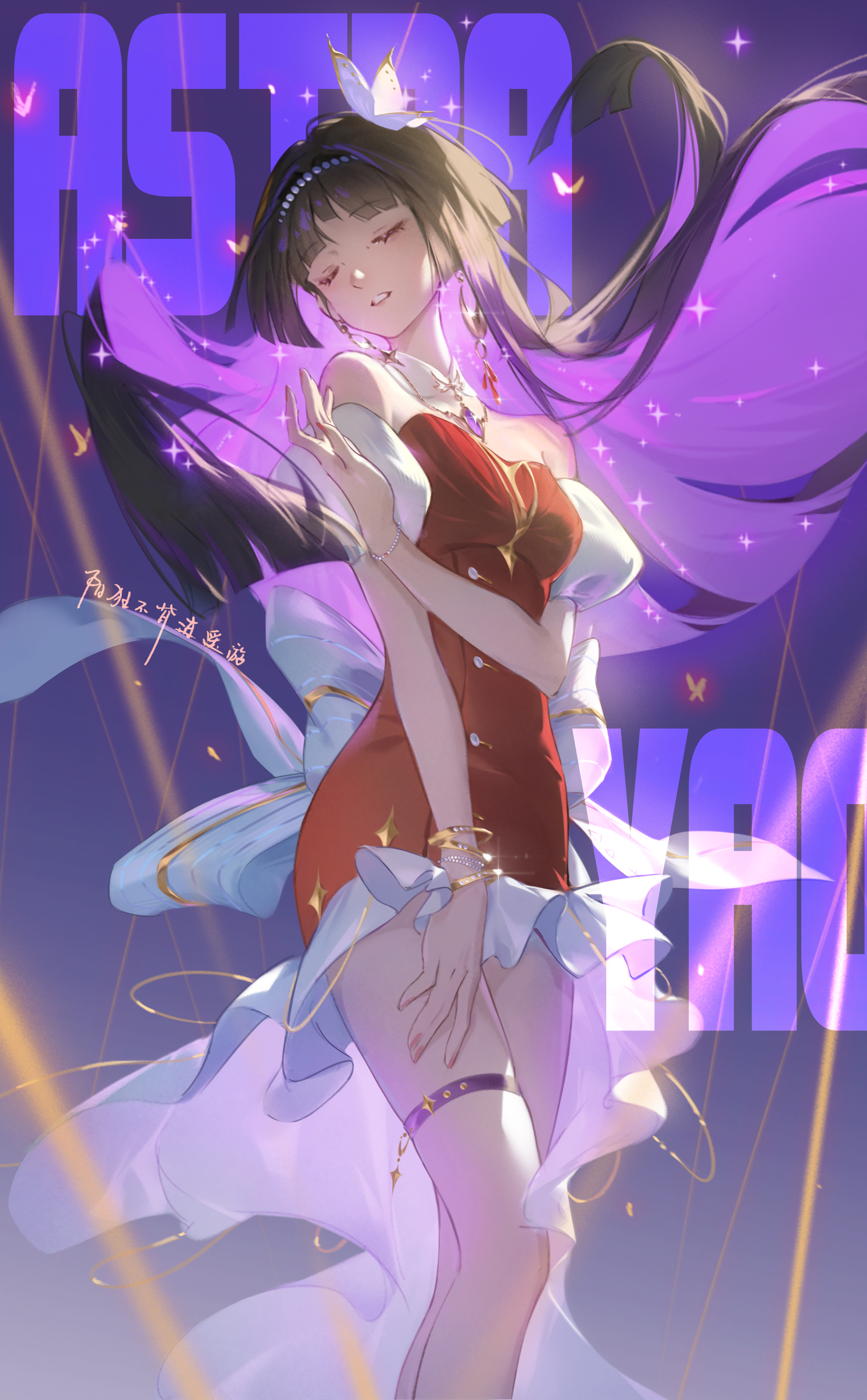 1girlartist nameblack hairbraceletbutterfly hair ornamentcharacter nameclosed eyescolored inner hairdetached collardressfacing viewerfeet out of framehair ornamentjewelrymulticolored hairparted lipspurple hairred dresssolotwo-tone hair