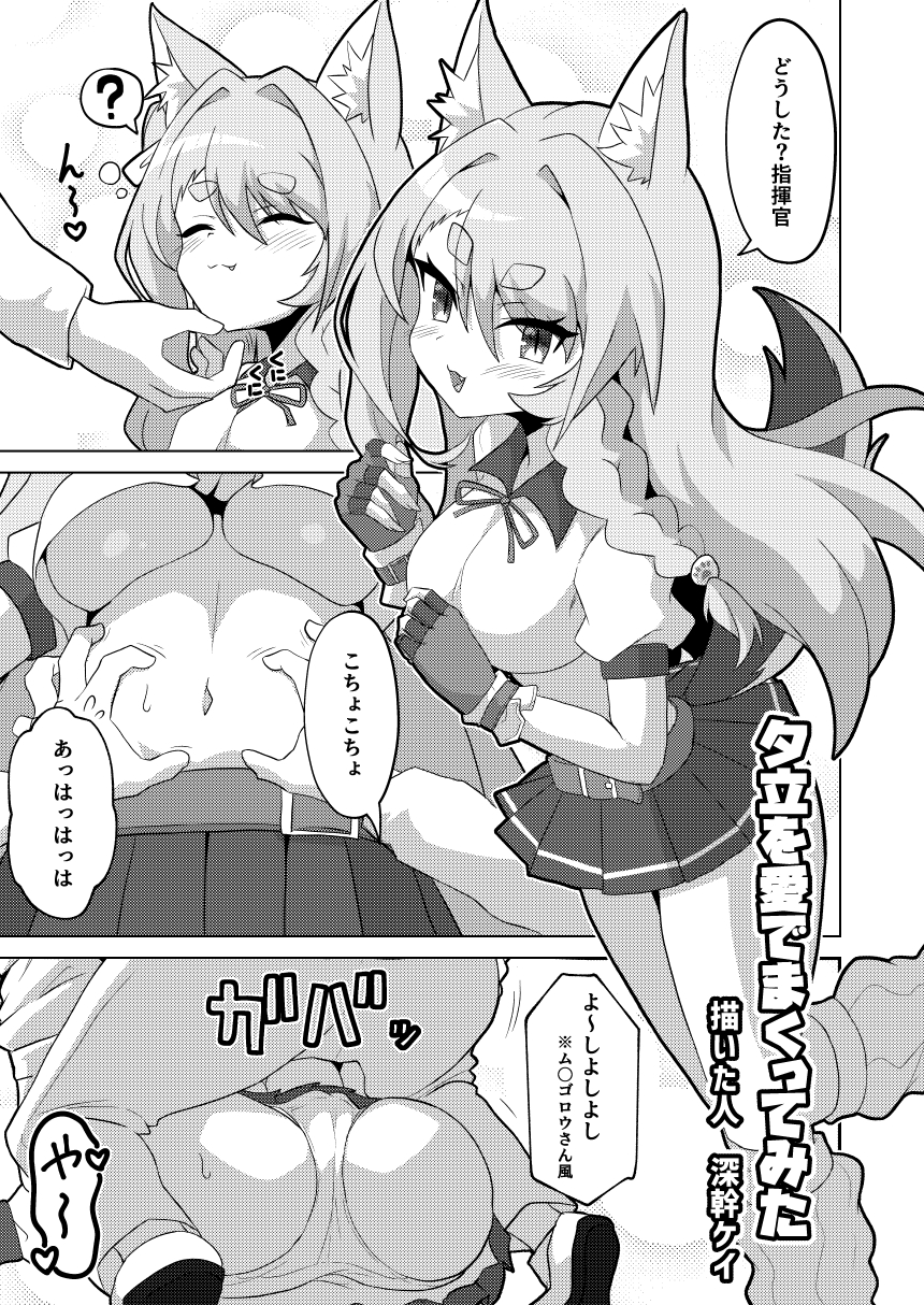 1boy1girlanimal ear fluffanimal earsbreastsclosed eyesclosed mouthfangfingerless glovesglovesgreyscalehand on another's chinlarge breastsleg warmersmilitary uniformminiskirtmonochromenaval uniformnavelpantiesskin fangskirtspeech bubblespoken question markstomachstroking another's chintailthick eyebrowsunderboobunderwearwhite pantieswolf earswolf girlwolf tail