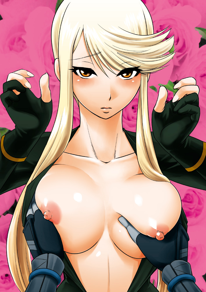 mustblove, ellen joe, zenless zone zero, highres, 1girl, adapted costume, alternate breast size (larger), areola slip, belly, bikini, black bikini, black hair, black hiphighs, black shrug, blush, breasts, colored inner hair, curvy, fins, fish tail, frontless outfit, grin, hair ornament, hairband, hiphighs, holding, holding weapon, huge breasts, large breasts, looking at viewer, maid headdress, metal hairband, micro bikini, mole, mole under eye, multicolored hair, navel piercing, nipples, piercing, plump, red eyes, red hair, revealing clothes, reverse bunnysuit, reverse outfit, scar, scar on tail, shark girl, shark tail, sharp teeth, short hair, shrug (clothing), simple background, smile, solo, spiked headband, swimsuit, tail, teeth, thick thighs, thighs, two-tone hair, weapon, wide hips