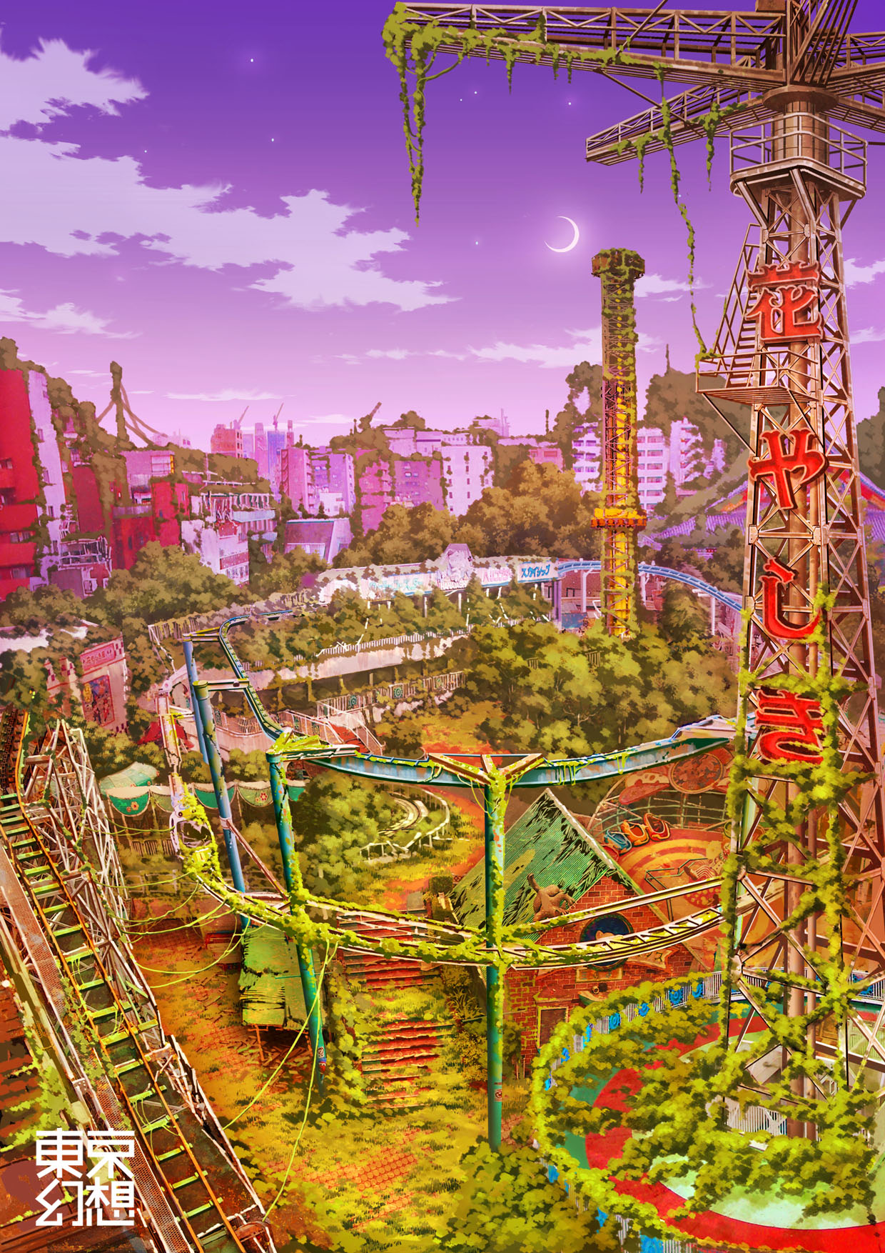 amusement parkcityscapecrescent moonmoonnightno humansovergrownreal world locationroller coasterruinsscenerystar (symbol)taitou (tokyo)tokyo (city)