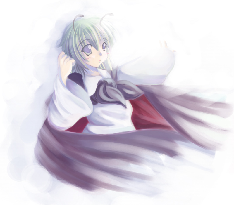 1girlantennaeblushcapefemale focusgradient backgroundgreen eyesgreen hairmatching hair/eyesshort hairsoloupper bodywhite background