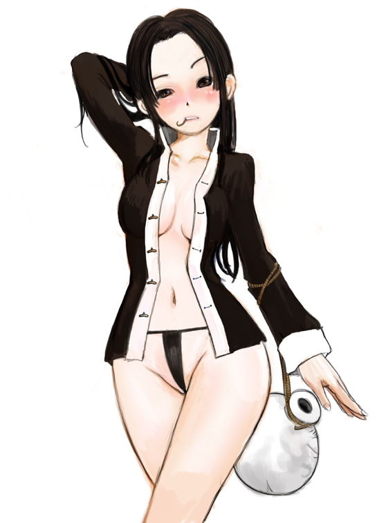 zenkou, translation request, 1girl, bat wings, blonde hair, breasts, female focus, horns, long hair, medium breasts, nipples, pointy ears, single horn, solo, thighhighs, topless female, wings, yellow eyes
