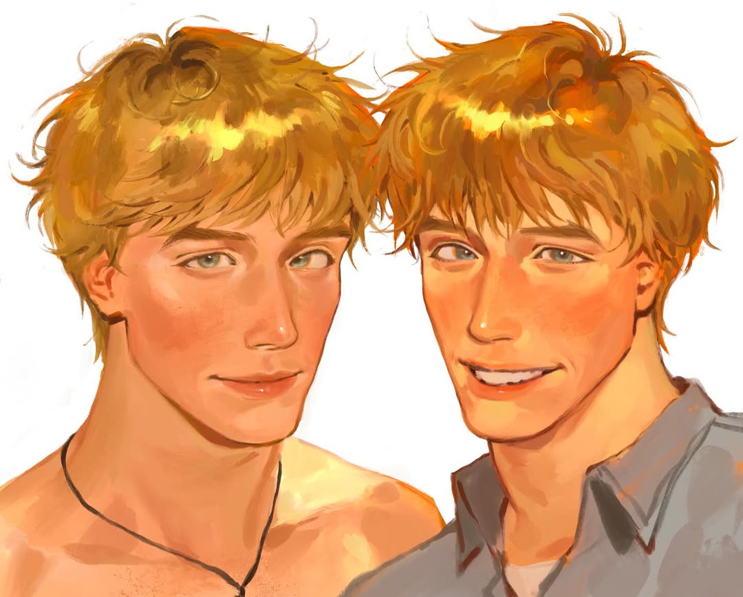 1boyblonde hairblue eyeschoppy bangsclosed mouthcollared shirtforked eyebrowsgrey shirtjewelrylight smilelooking at viewerlucas belmont (kunnuscumnus)multiple viewsnecklacenoseportraitshirtshort hairsimple backgroundsmileteethwhite background
