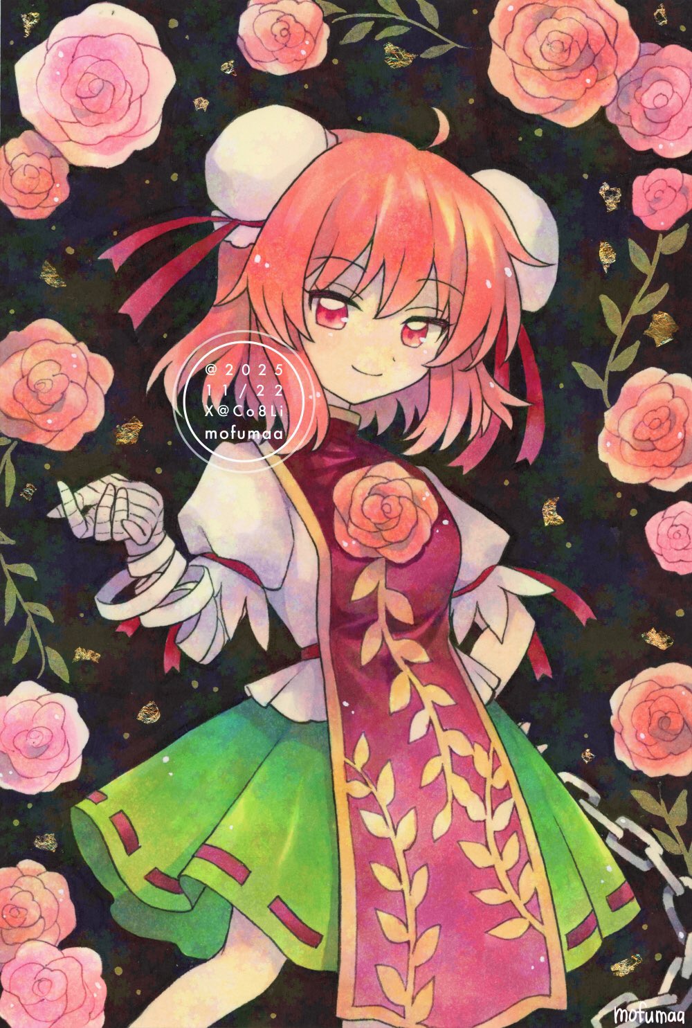 1girlartist namebandaged armbandagesbreastsbun coverchainclosed mouthdateddouble bunfalse armflowergreen skirthair bunlooking at viewerpink eyespink flowerpink hairpink rosepuffy short sleevespuffy sleevesred tabardribbon trimribbon-trimmed skirtroseshirtshort sleevesskirtsmilesolotabardwatermarkwhite shirt