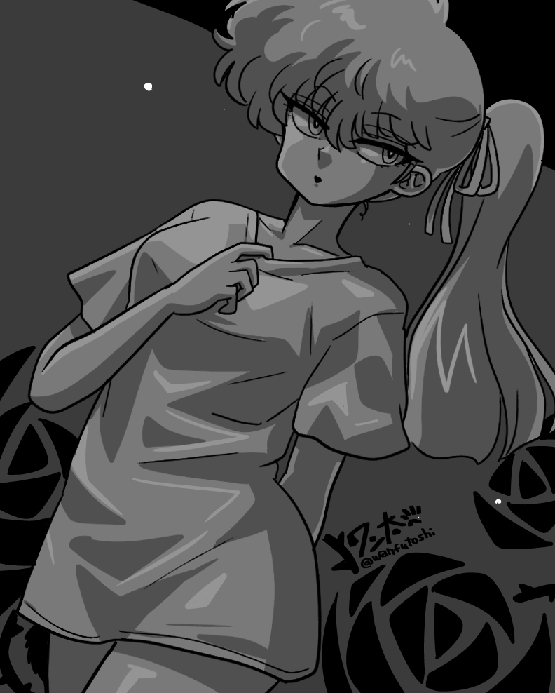 1girlartist namebreastscollarbonecowboy shotfloral backgroundgreyscalehand uplarge breastsmonochromeponytailpulling own clothesshirtshort sleevessignaturesolot-shirt