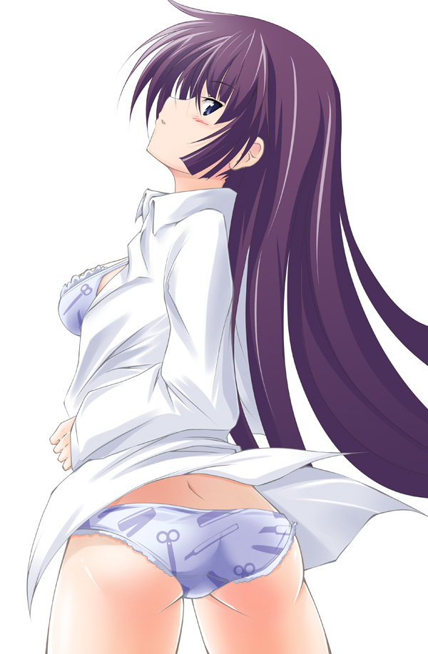 00s1girlassblue eyesblushbradress shirtfemale focusfrom behindlingerielong hairlooking backopen clothesopen shirtpantiesprint pantiesshirtsimple backgroundsolounderwearwhite background