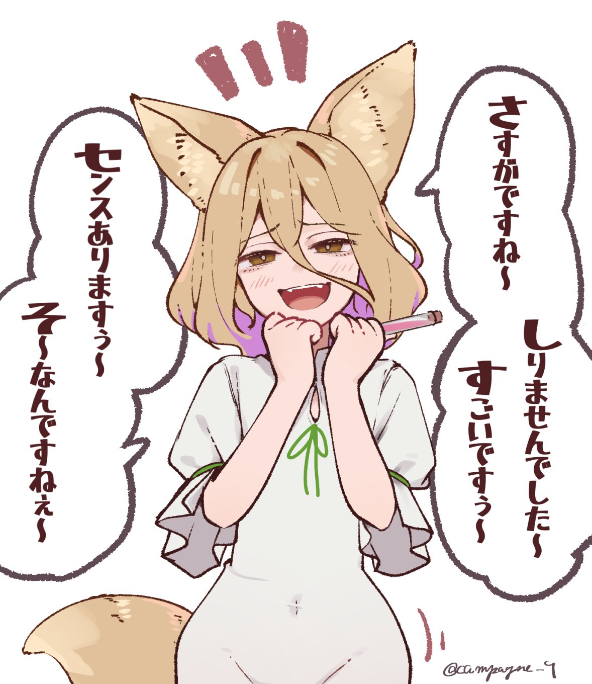 :d1girlanimal ear fluffanimal earsblonde hairbrown eyescovered groincovered navelcowboy shotdouble-parted bangsfox earsfox girlfox tailhair between eyeslong bangslooking at viewermedium hairopen mouthrompershort sleevessimple backgroundsmilesolospeech bubbletailteethtwitter usernameupper teeth onlywhite backgroundwhite romper