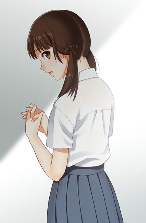 1girlblousebrown eyesbrown haircowboy shotfemale focusfrom behindfrom sidegrey backgroundgrey skirtinterlocked fingerslooking at viewerlooking backlow twintailsnapeopen mouthown hands claspedown hands togetherpleated skirtschool uniformshirtshort sleevesshyskirtsolotwintailswhite shirt