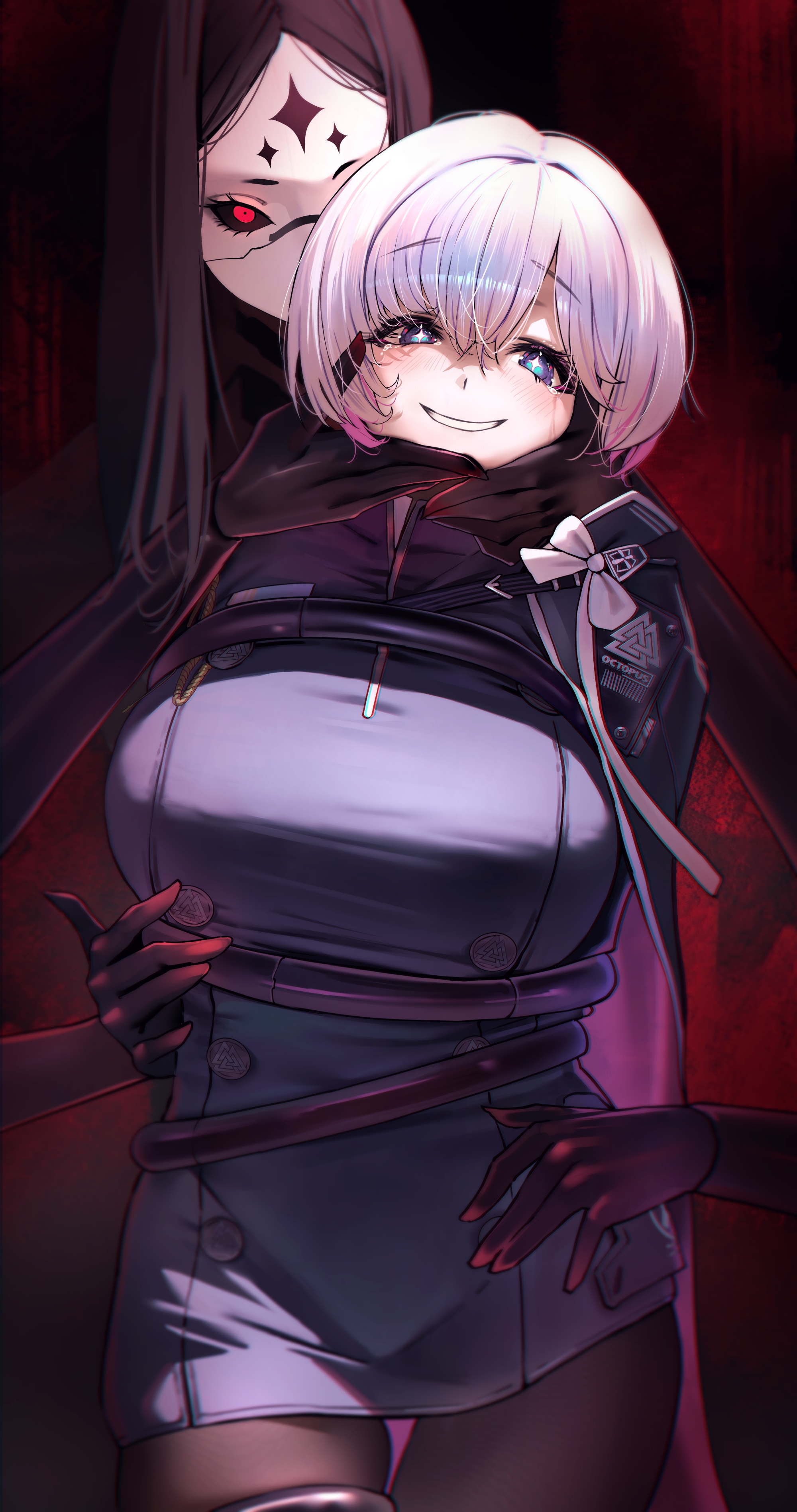 1girlbdsmblack hairblack pantyhoseblue eyesbondageboundbound armsbreastscryingcrying with eyes opendressearringsfingersmileforced smilehair between eyeshands on another's facejewelrylarge breastslong hairlooking at viewermulticolored hairmultiple girlsnose markingpantyhosepink hairred eyesshort hairsmilesymbol-shaped pupilstearstied up (nonsexual)white hair