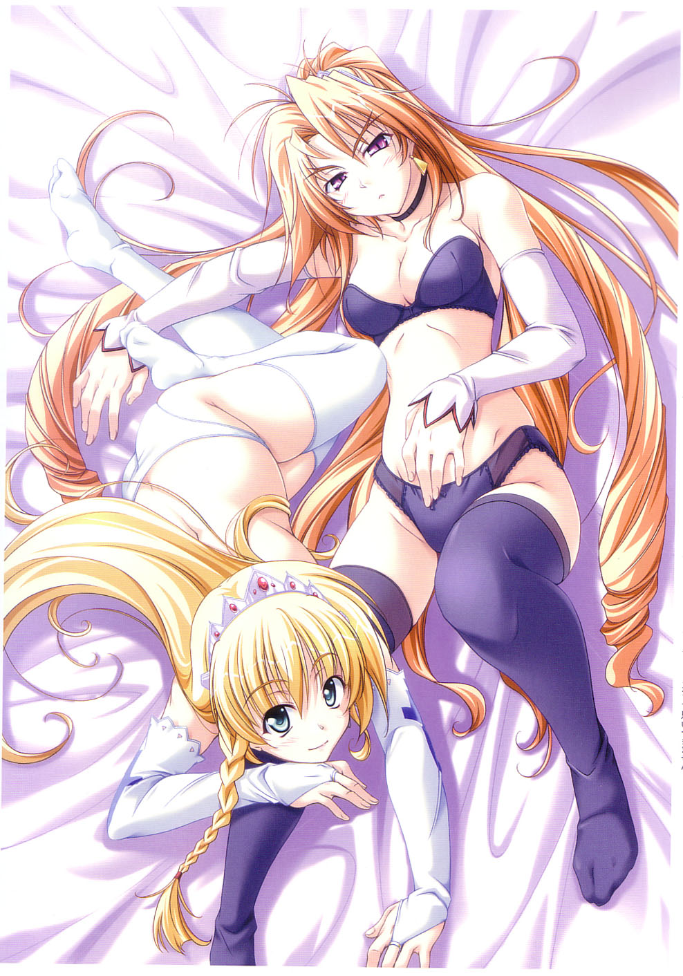 2girlsbed sheetblonde hairblue eyesblushbrabraidbreastsbridal gauntletschokercleavagedetached sleevesearringsforked eyebrowsglovesjewelrylegslingerielong hairlyingmultiple girlson backon stomachpurple eyessmilethighhighstiaraunderwearvery long hairwhite thighhighs