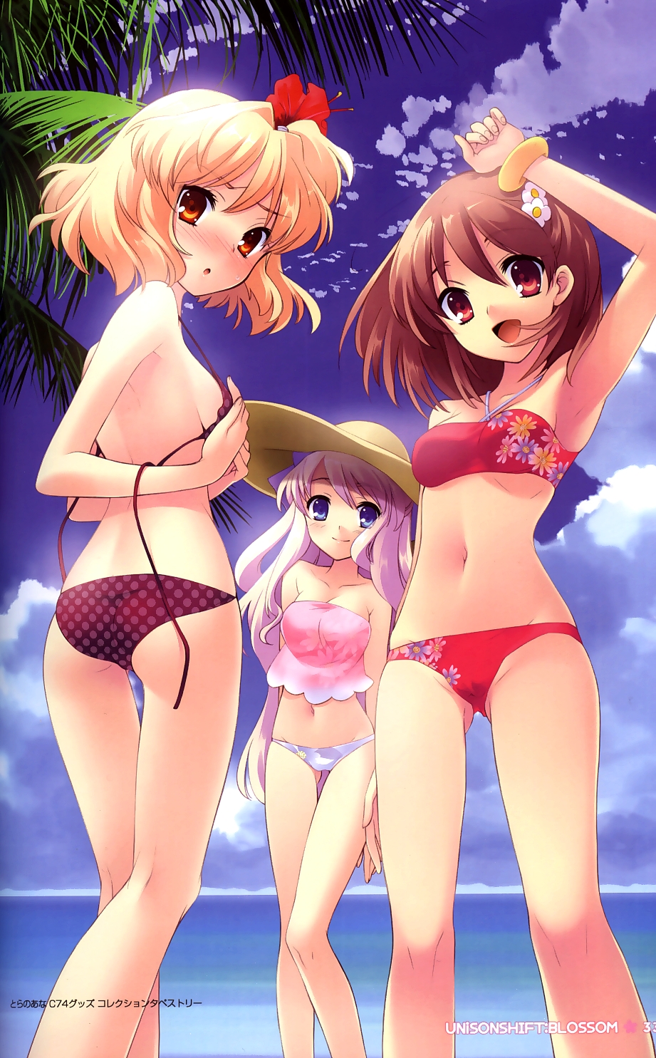 3girlsbikiniblonde hairblue eyesblushbreastsbrown hairdayfloral printflowerhair flowerhair ornamenthathibiscusmedium breastsmidriffmultiple girlsnavelpink hairpolka dotpolka dot bikinipolka dot swimsuitred eyessideboobsmall breastssmileswimsuittankiniwardrobe malfunctionyellow eyes