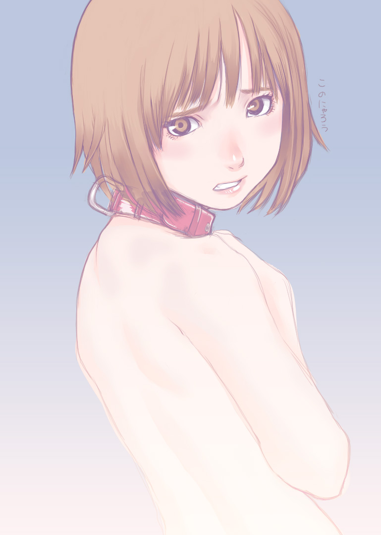 1girlbackblushbrown eyesbrown hairclenched teethcollarcovering breastscovering privatesfemale focusfrom behindlipslooking at viewerlooking backnudeshort hairsoloteethtopless frameupper body
