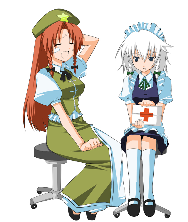 2girlsarm behind headbandaidfemale focusfirst aid kithairbandhatmaidmultiple girlsred hairsittingwhite hair