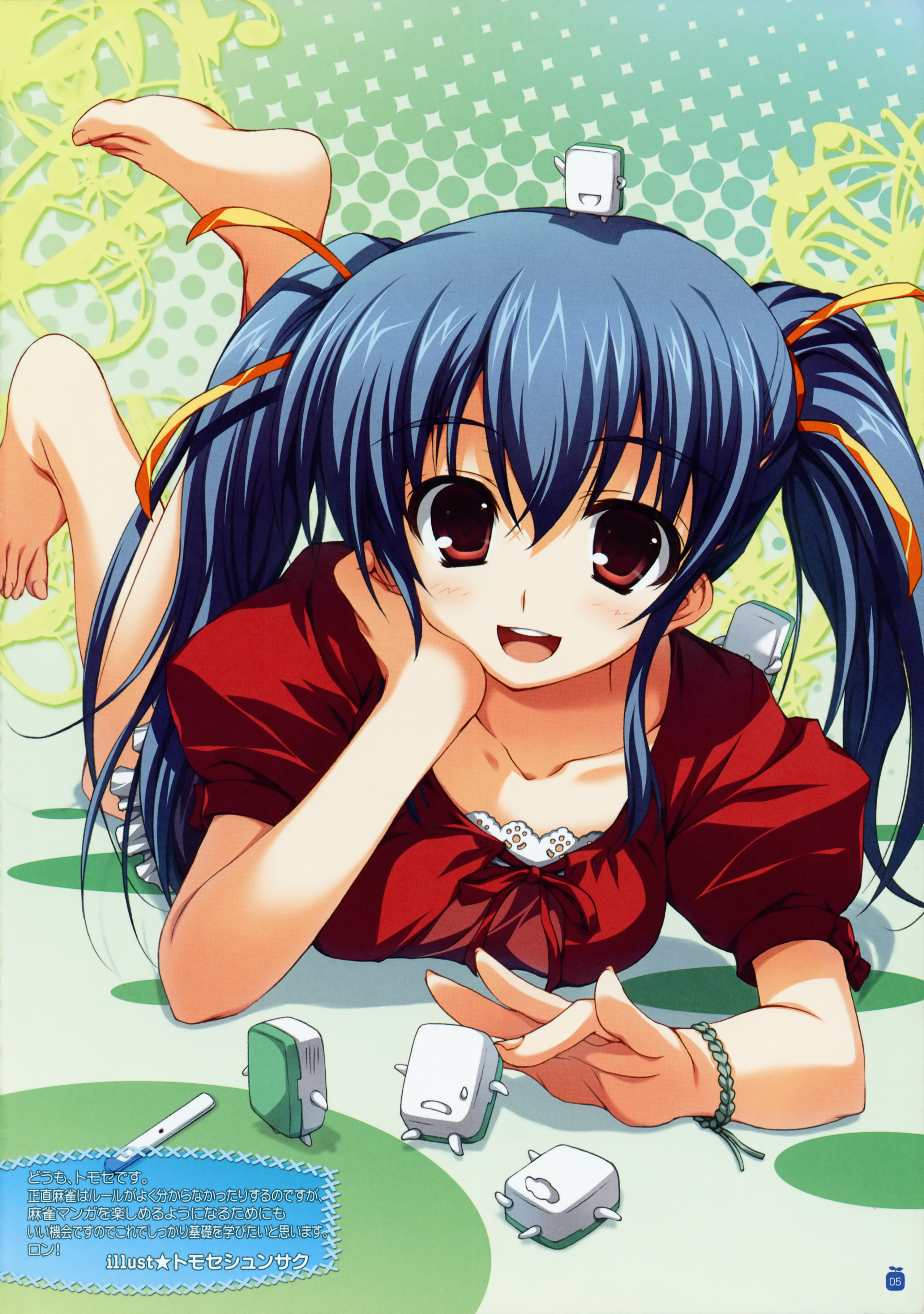 1girlbarefootblue hairblushboard gamebraceletfeetfemale focushair ribbonjewelrylyingmahjongon stomachred eyesribbonsolotwintails