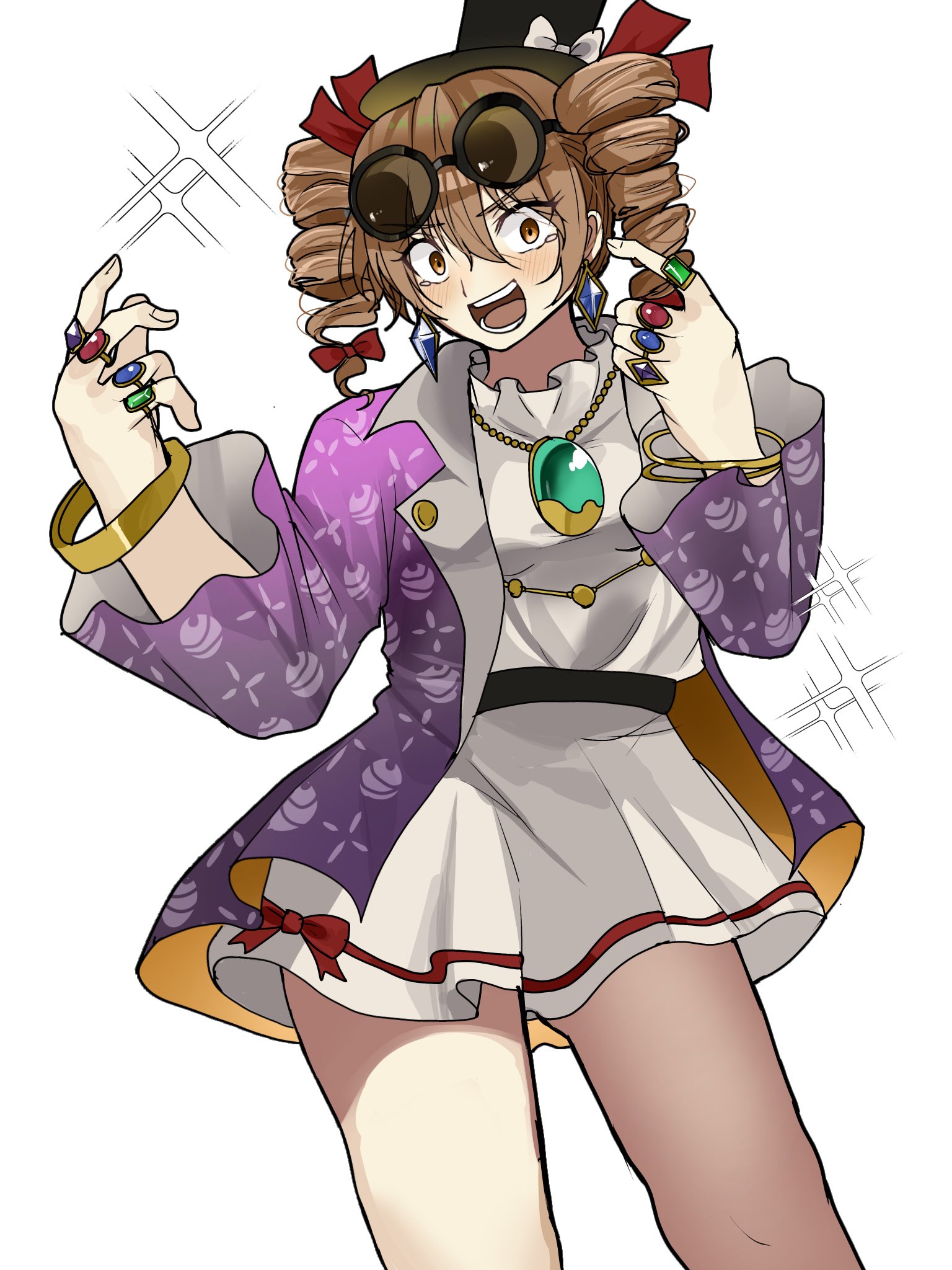 1girlblack hatbraceletbrown eyesbrown haircoatdressdrill hairearringseyewear on headhatjewelrylong sleevespendantpurple coatringround eyewearsimple backgroundsolosunglassestop hattwin drillswhite backgroundwhite dressyouna nan