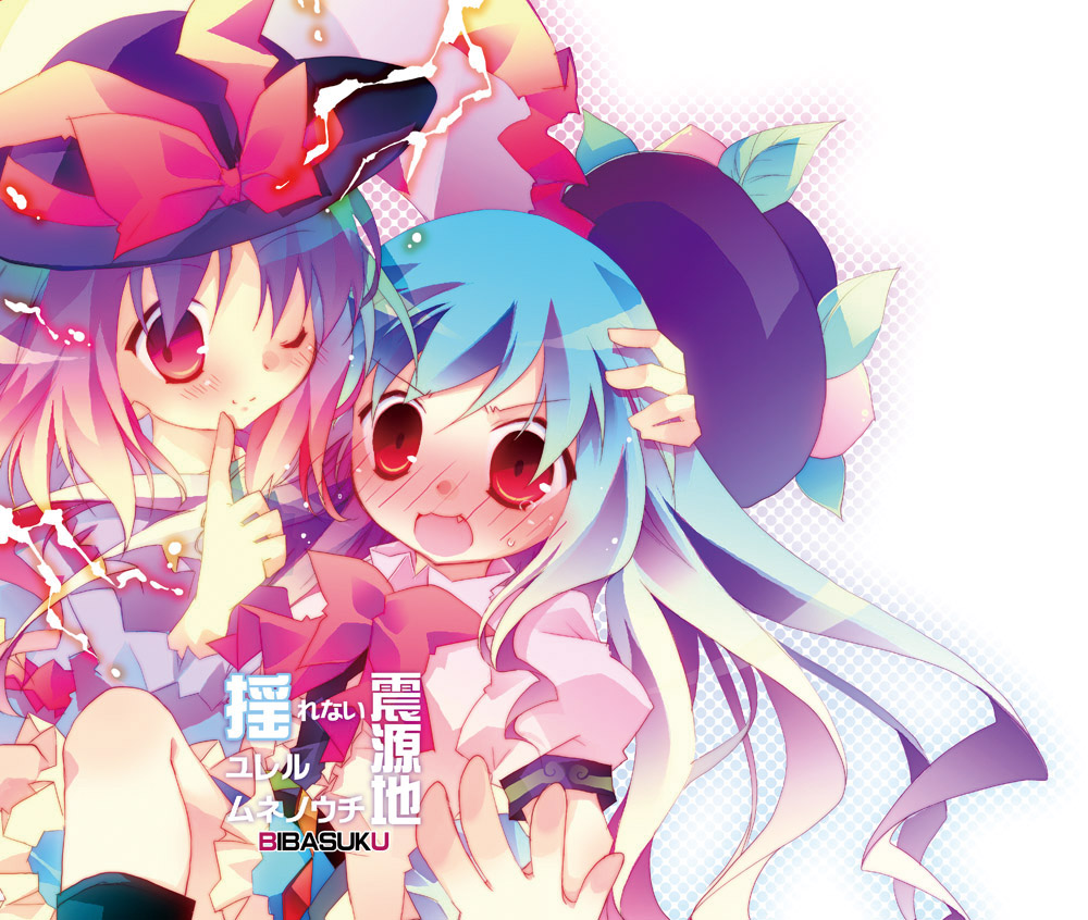 2girlsblack hatblue hairbowbowtiedressfemale focusfoodfruithatmultiple girlspeachpink dressred bowred bowtiered eyessimple backgroundunworn hatunworn headwearupper bodywhite backgroundyuri