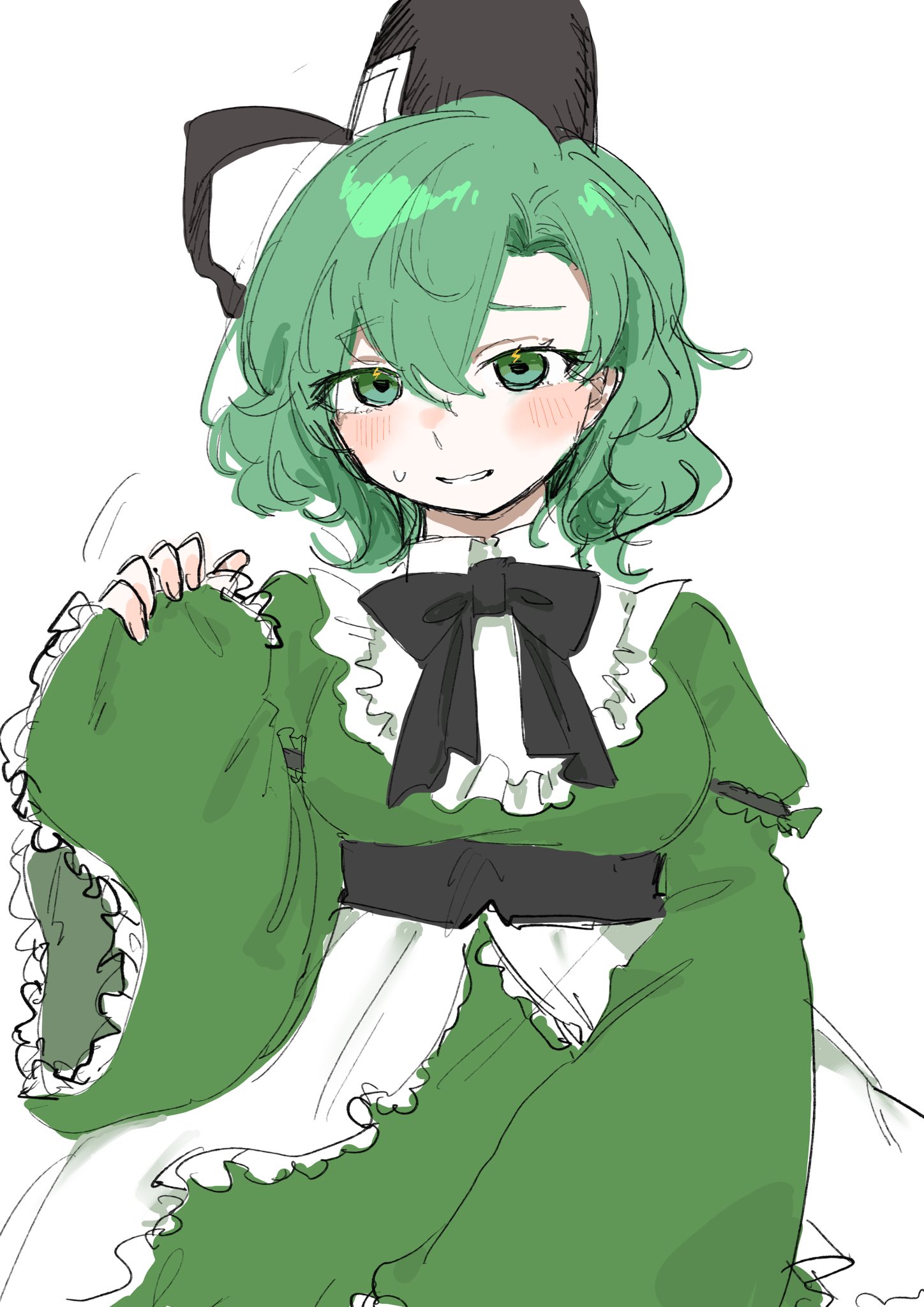 1girlblack bowblack bowtieblack hatblushbowbowtiegreen eyesgreen hairhatlong sleeveslooking at viewermaidshort hairsimple backgroundsolosweatdroptate eboshiwhite background