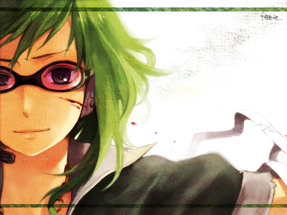 1girlbloodbokura no 16bit sensou (vocaloid)female focusgogglesgreen eyesgreen hairheadphonesheadsetjewelrymatching hair/eyesnecklaceshort hairsmilesolo