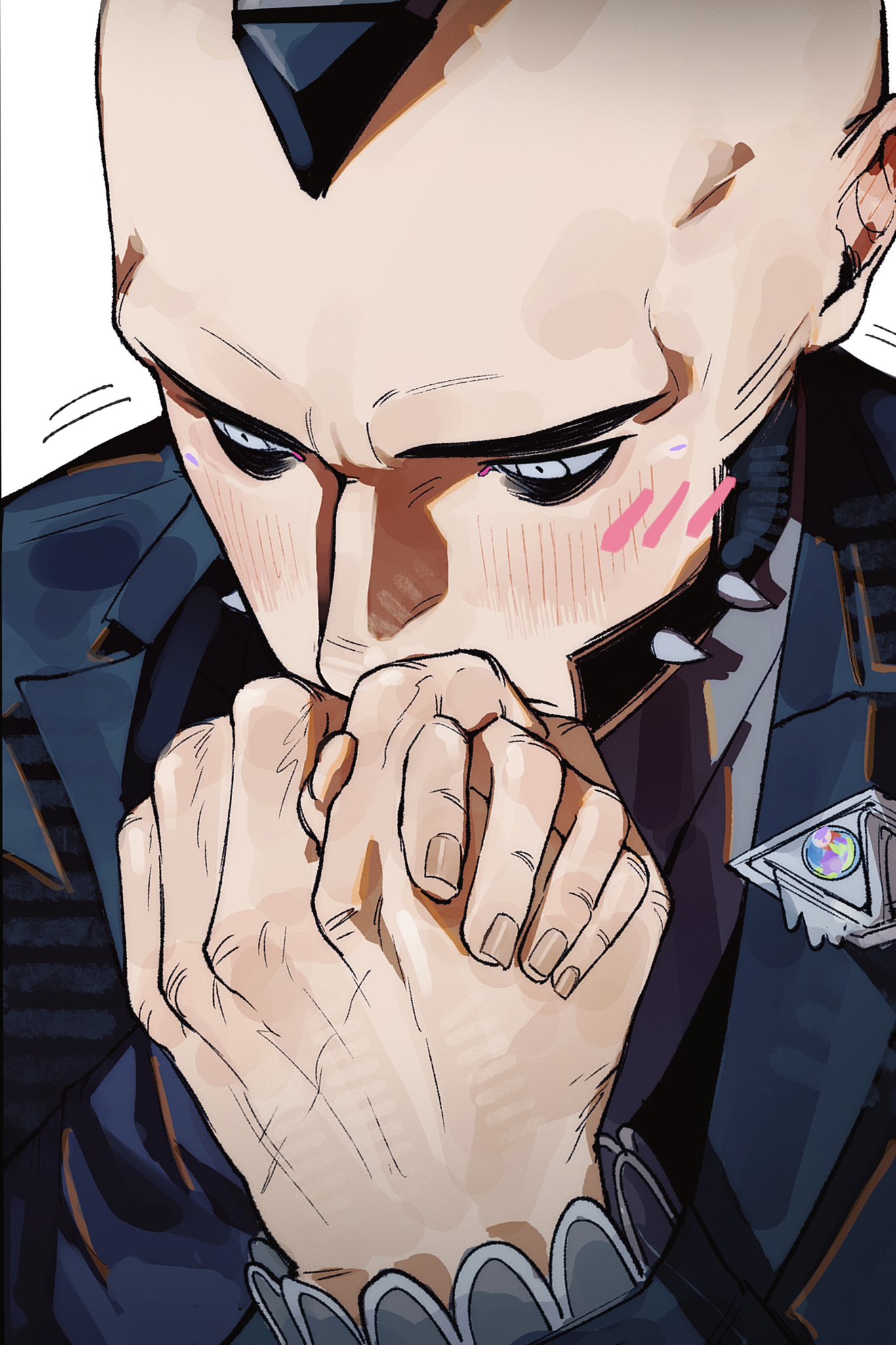 2boysblack hairblack jacketblack shirtblushcovered mouthear blushhand size differenceheight differenceholding handsimplied kissjacketlooking downmale focusmega stonemohawkmultiple boyspovshirtshort hairsideburnssimple backgroundsuit jacketwhite backgroundwhite eyesyaoi
