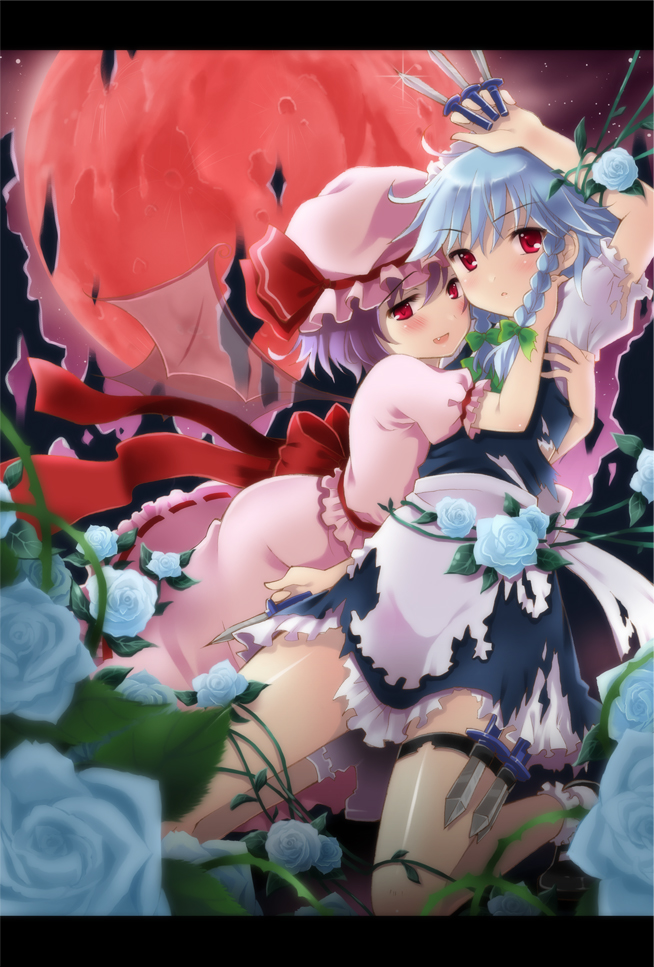 2girlsapronbetween fingersblue flowerblue hairblue roseblurryblushbraiddepth of fielddressfangfemale focusflowerfull moonhatholdingholding knifehugknifeknives between fingersletterboxedmoonmultiple girlsopen mouthplantred eyesred moonroseshort hairsmilethigh straptorn aprontorn clothestorn dresstwin braidsvineswhite flowerwhite rosewings