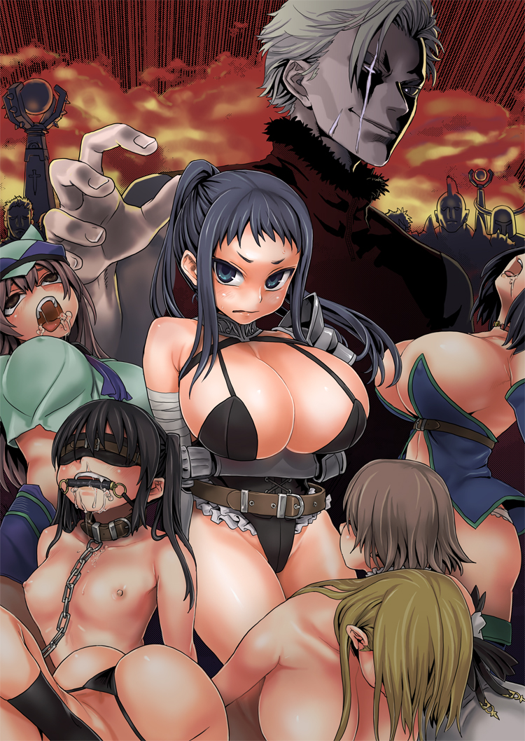 1boy6+girlsarmorassbeltblack hairblonde hairblue eyesblushbreastsbrown eyesbrown haircleavagecovered erect nippleshuge breastslong hairmultiple girlsnipplesshort hair