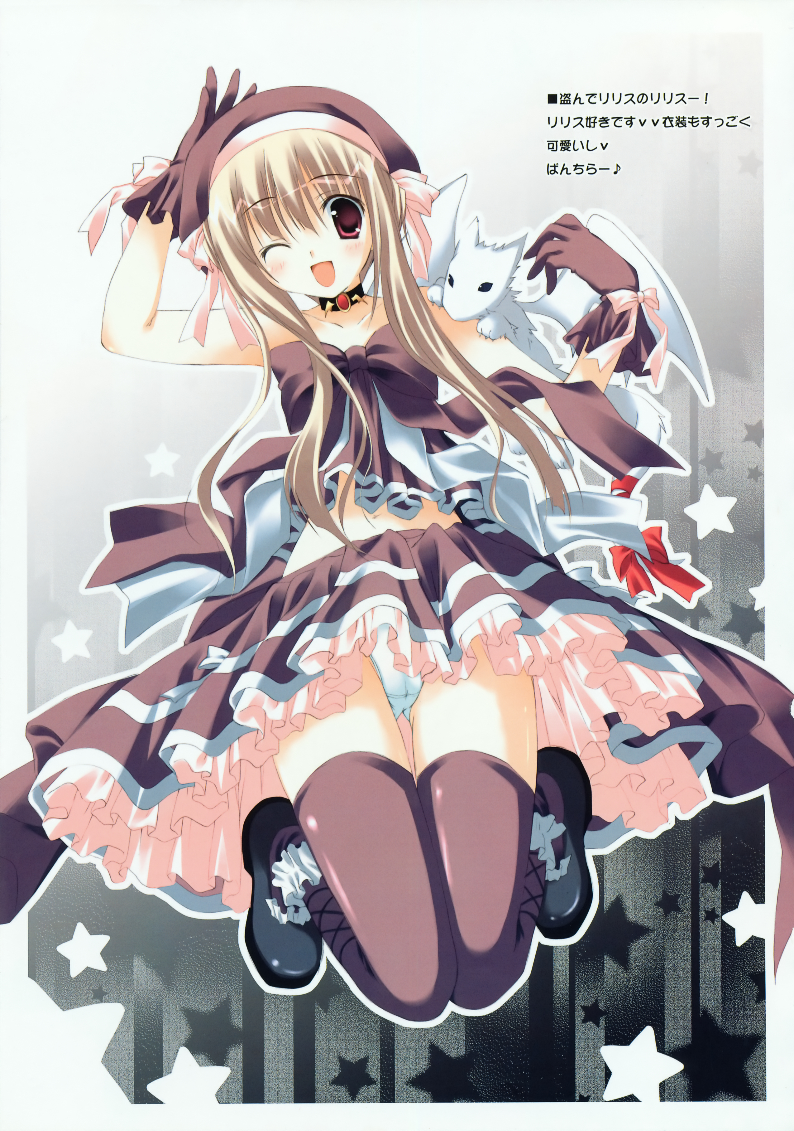 1girlbare shouldersblonde hairblushchokerdressfemale focusgloveshatone eye closedopen mouthpantiespantyshotpink eyesshoessmilesolothighhighsunderwearupskirtwink