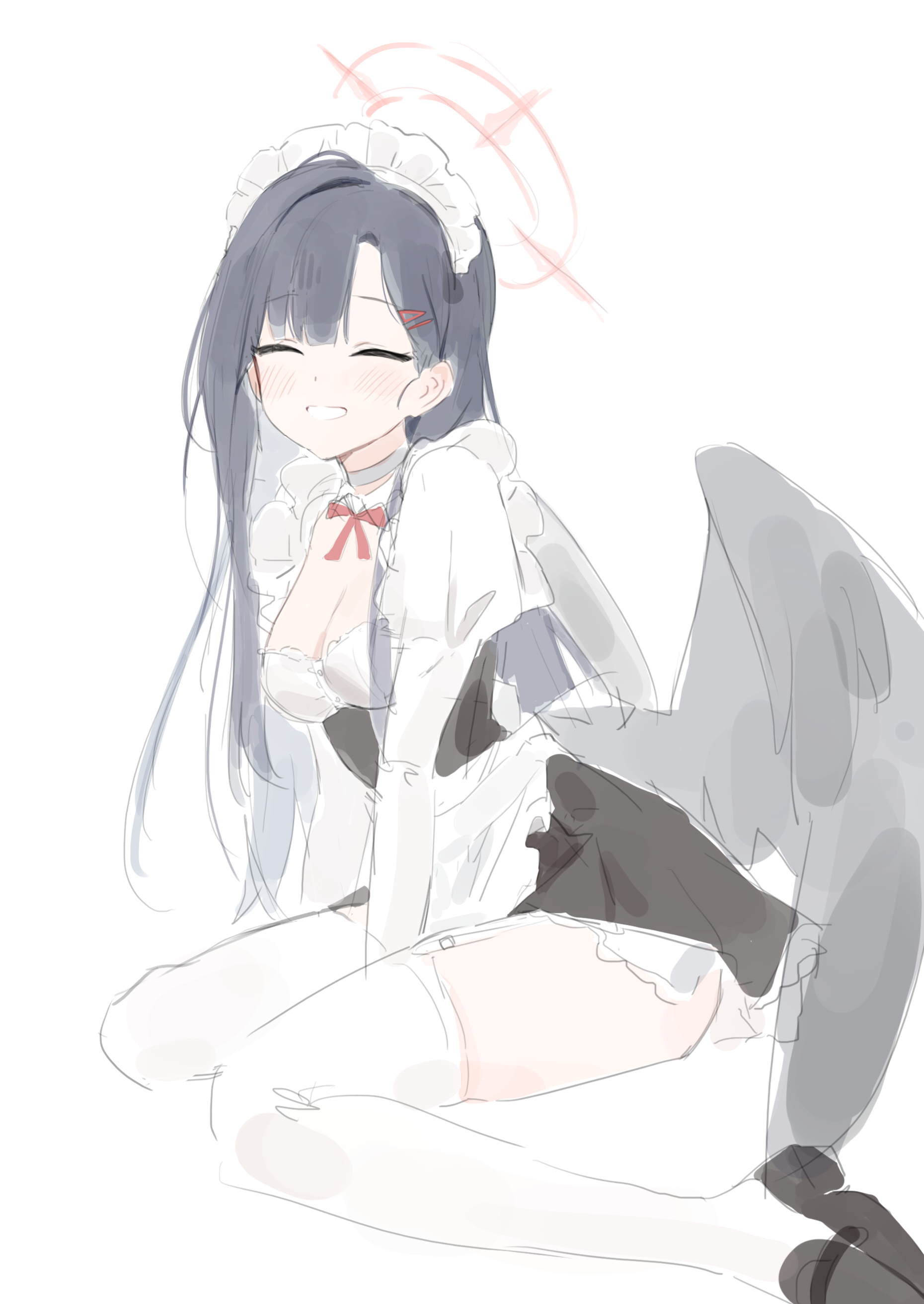 :d1girlalternate costumeapronbellblack dressblack hairblack shoesblack wingsblushbreastscleavageclosed eyesdressenmaidedfacing viewergarter strapsgrinhalojuliet sleeveslong hairlong sleevesmaidmaid headdressmedium breastsneck bellneck ribbonopen mouthparted lipspuffy sleevesred ribbonribbonshoessimple backgroundsittingsketchsmilesolothighhighswaist apronwarizawhite apronwhite backgroundwhite thighhighswings